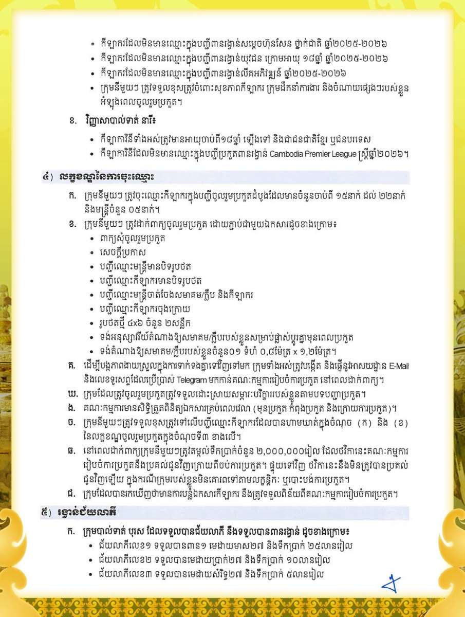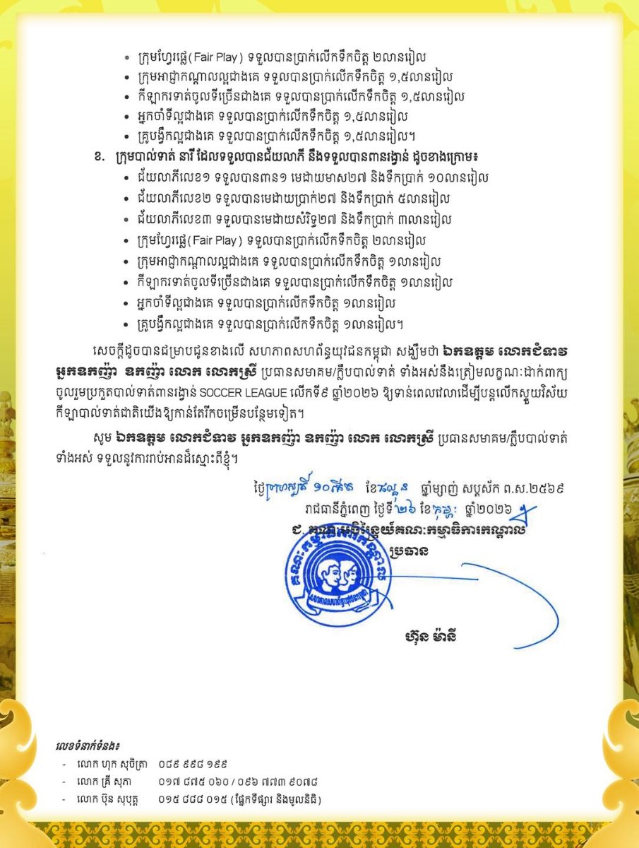 តាមរយៈនេះ ស.ស.យ.ក. បានជូនដំណឹងដល់សមាគម/ក្លិបបាល់ទាត់ទាំងអស់ ដែលមានបំណងចូលរួម អាចរកទិញពាក្យ និងដាក់ពាក្យចូលរួមប្រកួតប្រជែងបាន នៅអាគារ The Campus តាមមហាវិថីព្រះមុនីវង្ស សង្កាត់ទន្លេបាសាក់ ខណ្ឌចំការមន រាជធានីភ្នំពេញ ។ ការលក់ពាក្យ ចាប់ពីផ្ដើមពីថ្ងៃទី១០ ដល់ថ្ងៃទី២៥ ខែមីនា និងការទទួលពាក្យចាប់ផ្ដើមពីថ្ងៃទី១៥ ដល់ថ្ងៃទី៣១ ខែមីនា ឆ្នាំ២០២៦។