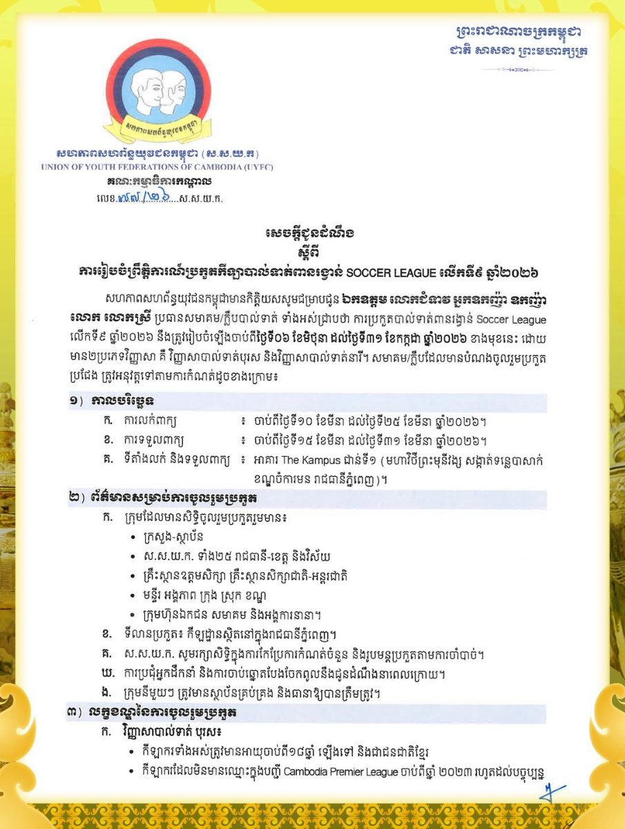 សហភាពសហព័ន្ធយុវជនកម្ពុជា(ស.ស.យ.ក.) បានប្រកាសបើកការប្រកួតបាល់ទាត់ដណ្តើមពានរង្វាន់ Soccer League រដូវកាលថ្មី ឆ្នាំ២០២៦ នាដើមខែមិថុនាខាងមុខ ខណៈការចុះឈ្មោះចូលរួមនឹងចាប់ផ្ដើមទទួលពាក្យ នៅពាក់កណ្ដាលខែមីនានេះ។
