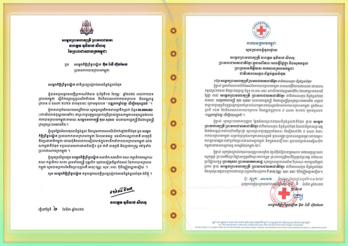 «ខ្ញុំម្ចាស់ ព្រមទាំងសហការីទាំងអស់នៃកាកបាទក្រហមកម្ពុជា មានសេចក្តីរីករាយឥតឧបមា ដោយបានទទួលព្រះរាជសារ និងព្រះរាជទ្រព្យ ចំនួន 50.000 USD (ហាសិបពាន់ដុល្លារអាម៉េរិក) ដែលជាព្រះរាជទានដ៏ថ្លៃថ្លា របស់ សម្តេចព្រះមហាក្សត្រី ព្រះវររាជមាតាជាតិខ្មែរ ជាទីគោរពសក្ការៈដ៏ខ្ពង់ខ្ពស់បំផុតតាមរយៈ សម្តេចមហាមន្ត្រី គុយ សុផល ឧបនាយករដ្ឋមន្ត្រី និងជារដ្ឋមន្ត្រីក្រសួងព្រះបរមរាជវាំង សម្រាប់ជាព្រះរាជូបត្ថម្ភដ៏ឧត្តុង្គឧត្តមជួយគាំទ្រដល់សកម្មភាពមនុស្សធម៌របស់កាកបាទក្រហមកម្ពុជា ក្នុងឱកាសខួបទី ១៦៣ ទិវាពិភពលោកកាកបាទក្រហម និងអឌ្ឍចន្ទក្រហម ៨ ឧសភា ២០២៦ ក្រោមមូលបទ “បន្តរួមកម្លាំងគ្នា ដើម្បីមនុស្សធម៌”។