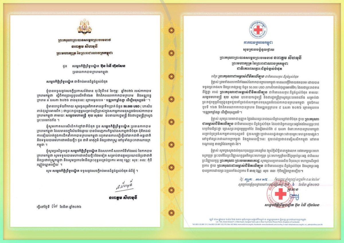 «ខ្ញុំម្ចាស់ ព្រមទាំងសហការីទាំងអស់នៃកាកបាទក្រហមកម្ពុជា មានសេចក្តីរីករាយឥតឧបមា ដោយបានទទួលព្រះរាជសារ និងព្រះរាជទ្រព្យ ចំនួន 50.000 USD (ហាសិបពាន់ដុល្លារអាម៉េរិក) ដែលជាព្រះរាជទានដ៏ថ្លៃថ្លា របស់ ព្រះករុណាជាអម្ចាស់ជីវិតលើត្បូង ជាទីគោរពសក្ការៈដ៏ខ្ពង់ខ្ពស់បំផុត តាមរយៈសម្តេចមហាមន្ត្រី គុយ សុផល ឧបនាយករដ្ឋមន្ត្រី និងជារដ្ឋមន្ត្រីក្រសួងព្រះបរមរាជវាំង សម្រាប់ជាព្រះរាជូបត្ថម្ភដ៏ឧត្តុង្គឧត្តមជួយគាំទ្រដល់សកម្មភាពមនុស្សធម៌របស់កាកបាទក្រហមកម្ពុជា ក្នុងឱកាសខួបទី ១៦៣ ទិវាពិភពលោកកាកបាទក្រហម និងអឌ្ឍចន្ទក្រហម ៨ ឧសភា ២០២៦ ក្រោមមូលបទ “បន្តរួមកម្លាំងគ្នា ដើម្បីមនុស្សធម៌”។