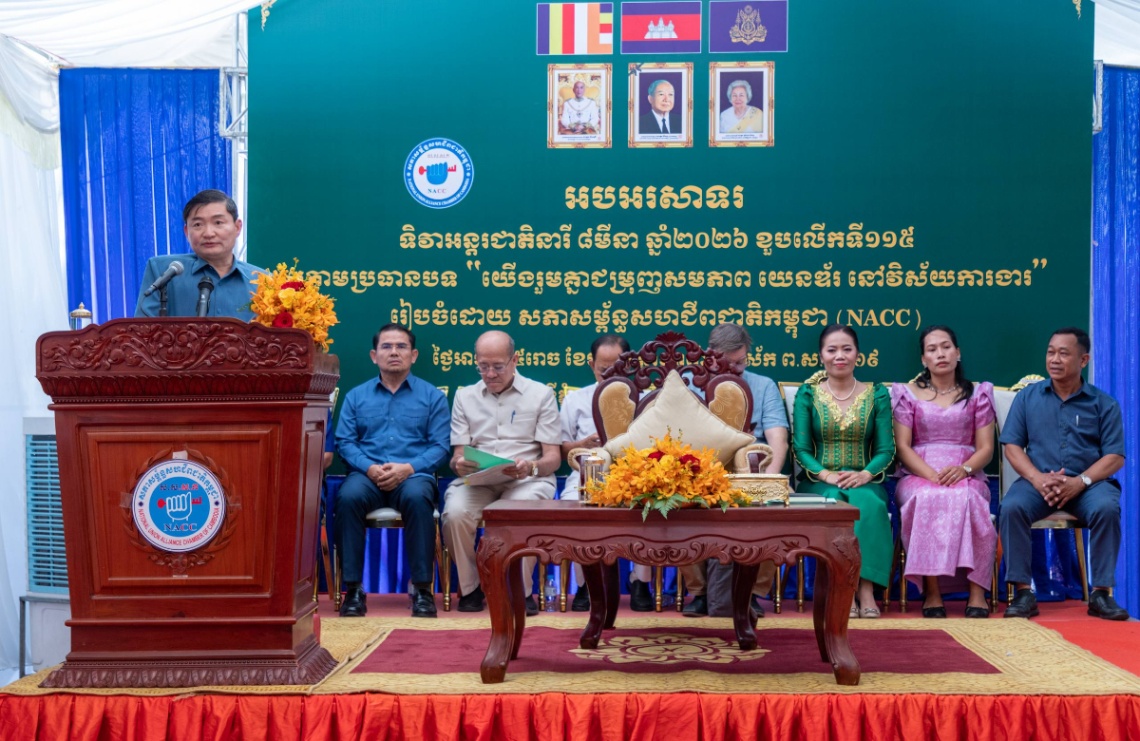 ក្នុងកម្មវិធីអបអរសាទរខួបលើកទី១១៥ នៃទិវាអន្តរជាតិនារី ៨មីនា ដែលរៀបចំឡើងដោយសភាសម្ព័ន្ធសហជីពជាតិកម្ពុជា (NACC) ក្រោមប្រធានបទ «យើងរួមគ្នាជំរុញសមភាពយេនឌ័រ ក្នុងវិស័យការងារ» កាលពីរសៀលថ្ងៃទី៨ ខែមីនា ឆ្នាំ២០២៦នេះ ឯកឧត្តម ហេង សួរ រដ្ឋមន្ត្រីក្រសួងការងារ និងបណ្តុះបណ្តាលវិជ្ជាជីវៈ បានលើកឡើងថា កម្មការិនីនៅតាមសហគ្រាស ក្រុមហ៊ុន រោងចក្រ កំពុងដើរតួនាទីយ៉ាងសំខាន់ក្នុងការលើកស្ទួយសេដ្ឋកិច្ចគ្រួសារ និងជំរុញកំណើនសេដ្ឋកិច្ចជាតិ តាមរយៈការចូលរួមផលិតផលិតផលសម្រាប់នាំចេញទៅទីផ្សារអន្តរជាតិ ទន្ទឹមនឹងការបំពេញតួនាទីដ៏មមាញឹកនៅក្នុងគ្រួសារ។
