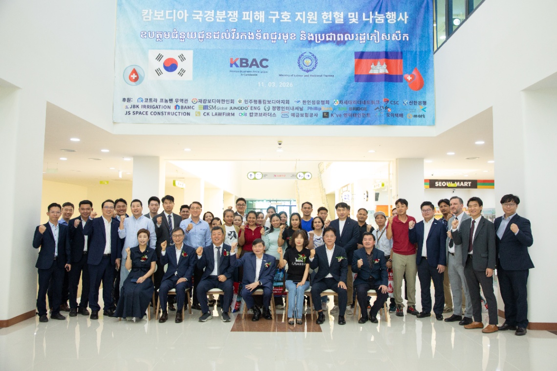 ឯកឧត្តម ហេង សួរ រដ្ឋមន្រ្តីក្រសួងការងារ និងបណ្តុះបណ្តាលវិជ្ជាជីវៈ បានអញ្ជើញចូលរួមក្នុង ”ព្រឹត្តិការណ៍សប្បុរសធម៌ សម្រាប់ជួយដល់ជនរងគ្រោះកម្ពុជានៅតាមព្រំដែន” របស់សមាគមធុរកិច្ចកូរ៉េនៅកម្ពុជា សម្រាប់ផ្តល់ជាអំណោយជូនដល់ជនភៀសសឹក និងវីរកងទ័ពជួរមុខ កាលពីព្រឹកថ្ងៃទី១១ ខែមីនា ឆ្នាំ២០២៦។