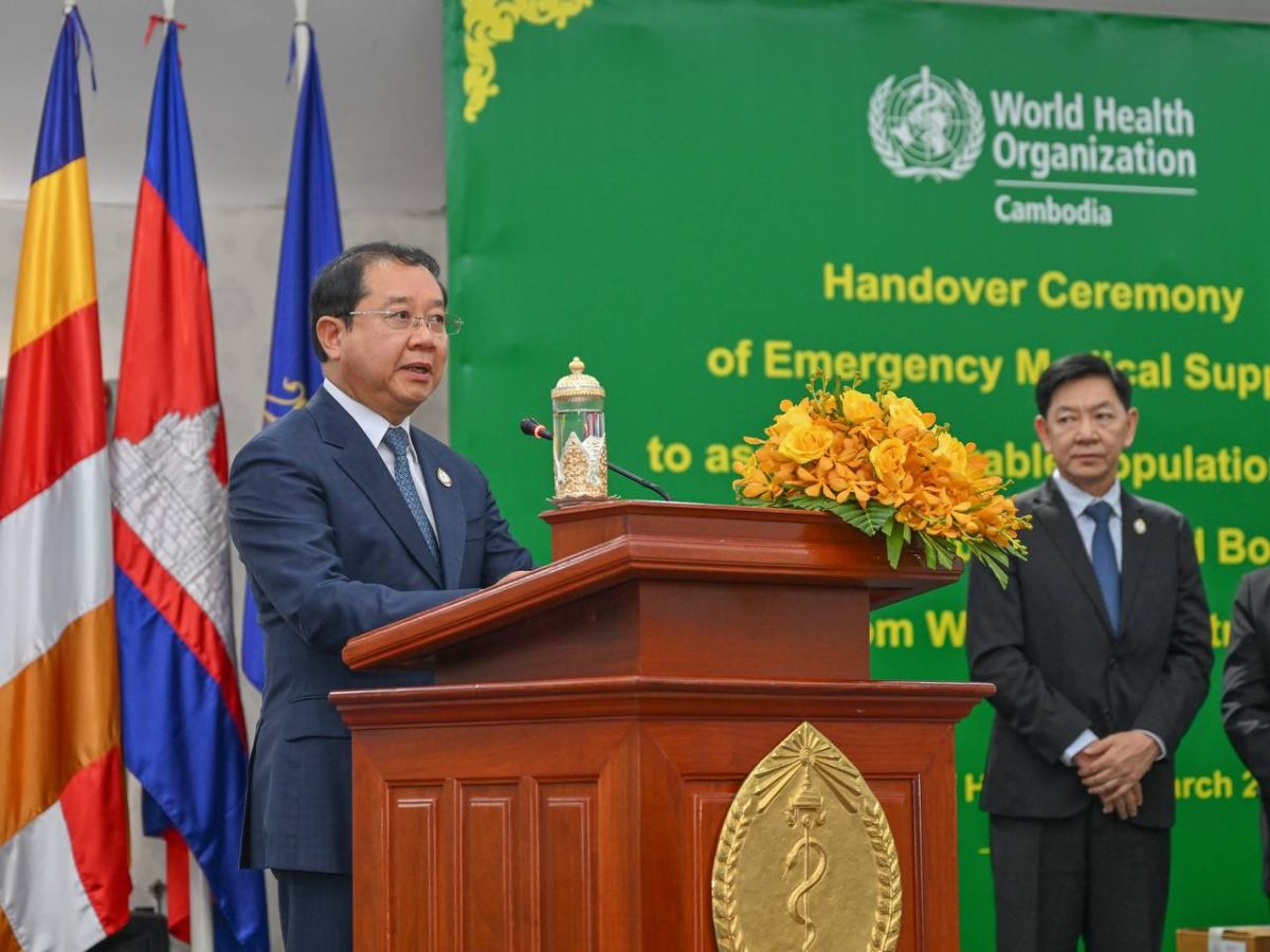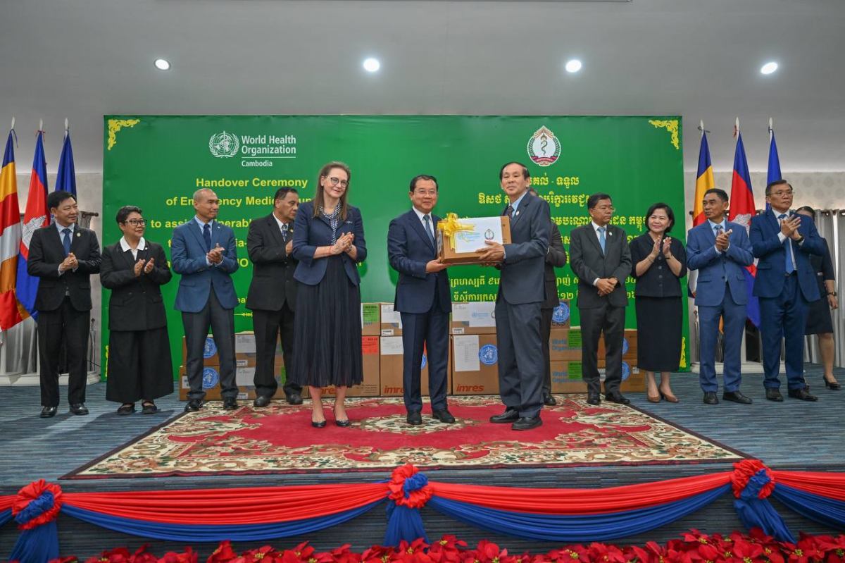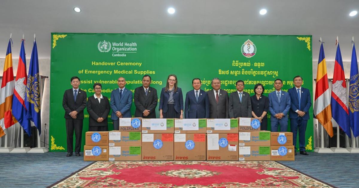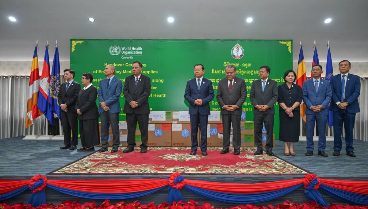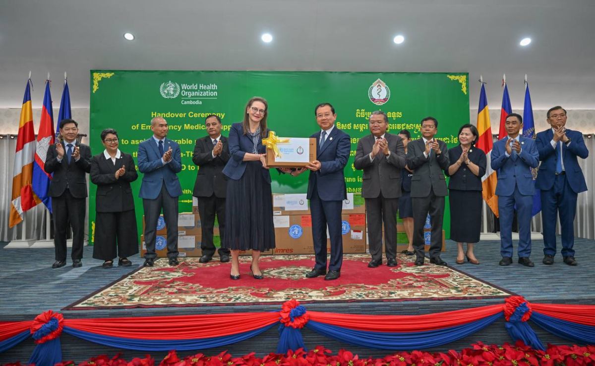 ពិធីប្រគល់សម្ភារៈនេះ បានប្រារព្ធឡើងក្រោមអធិបតីភាព ឯកឧត្តមសាស្ត្រាចារ្យ ឈាង រ៉ា រដ្ឋមន្ត្រីក្រសួងសុខាភិបាល និង លោកស្រីវេជ្ជបណ្ឌិត Marianna Trias តំណាងអង្គការ សុខភាពពិភពលោកប្រចាំកម្ពុជា។ សម្ភារៈជំនួយដែលបានផ្តល់រួមមាន ឧបករណ៍សង្គ្រោះបន្ទាន់ និងវះកាត់ (TESK) កញ្ចប់សង្គ្រោះបន្ទាន់ (IEHK) ព្រមទាំងឱសថ និងសម្ភារៈ វេជ្ជសាស្ត្រចាំបាច់ផ្សេងៗ ដើម្បីគាំទ្រមន្ទីរពេទ្យ និងមណ្ឌលសុខភាពក្នុងការផ្តល់សេវា ព្យាបាល និងរក្សាបន្តសេវាសុខាភិបាលចាំបាច់សម្រាប់ប្រជាពលរដ្ឋដែលរងផលប៉ះពាល់។