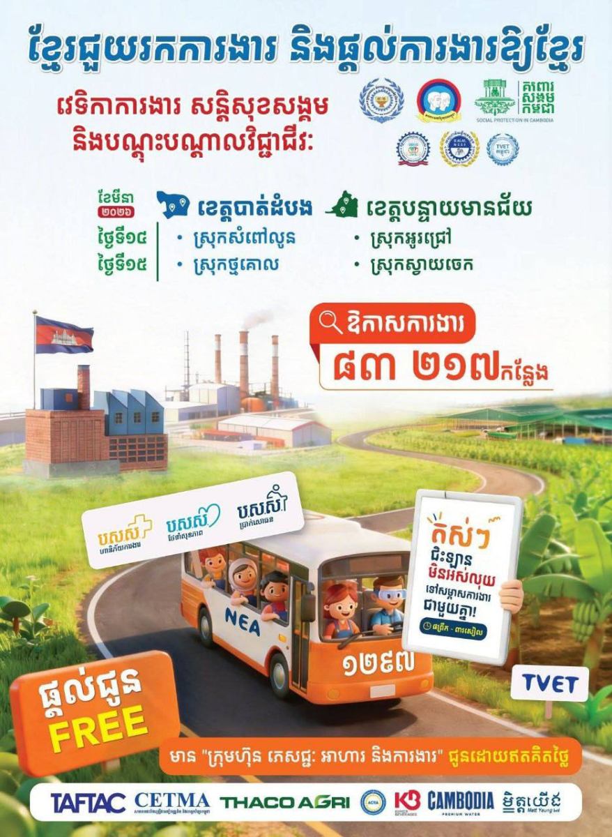 ក្រសួងការងារ និងបណ្តុះបណ្តាលវិជ្ជាជីវៈ នៅថ្ងៃទី១៤ និង១៥ ខែមីនា ឆ្នាំ២០២៦នេះបន្តបើកយុទ្ធនាការចុះផ្សព្វផ្សាយព័ត៌មានអំពីឱកាសការងារ សន្តិសុខសង្គម និងបណ្តុះបណ្តាលវិជ្ជាជីវៈ នៅខេត្តបាត់ដំបង និងខេត្តបន្ទាយមានជ័យ ដែលនាំយកឱកាសការងារចំនួនជាង ៨ម៉ឺនកន្លែង ទៅផ្សព្វផ្សាយជូនដល់ប្រជាពលរដ្ឋ ជាពិសេសអតីតពលករខ្មែរត្រឡប់មកពីប្រទេសថៃ។