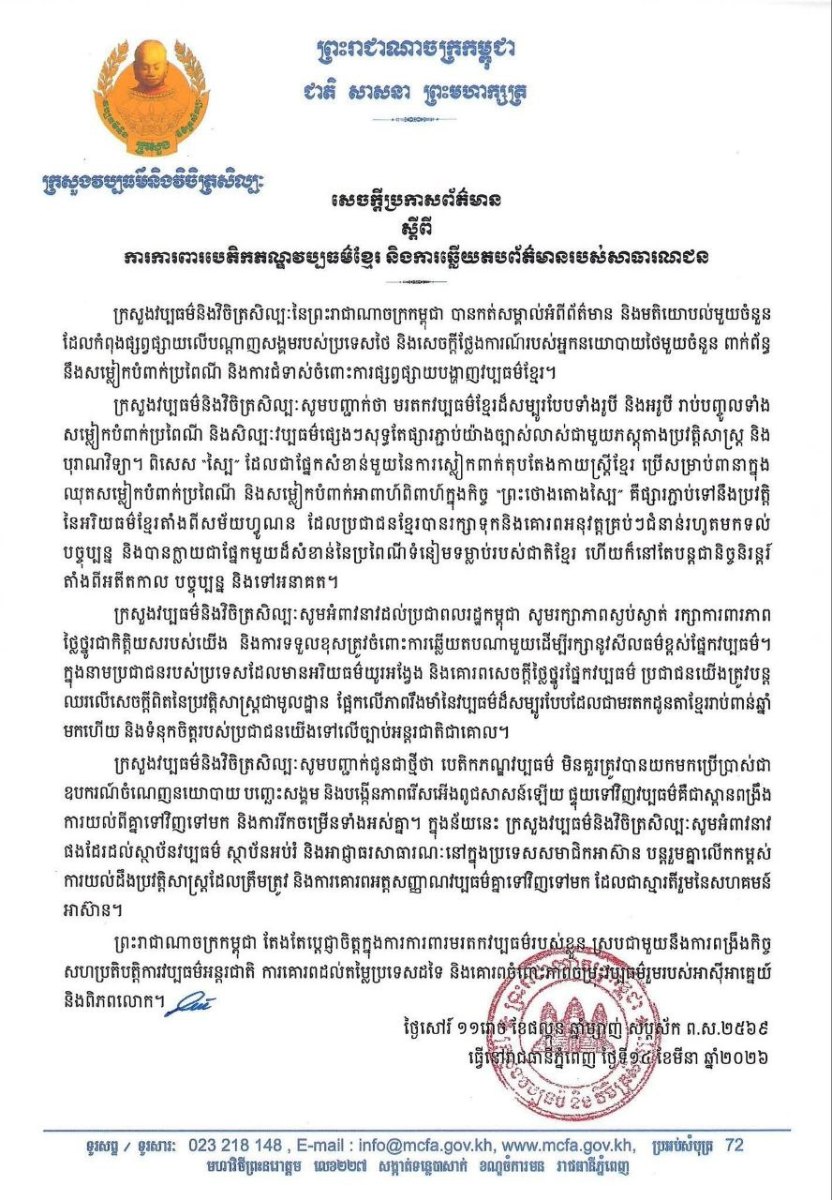 ក្រសួងវប្បធម៌ និងវិចិត្រសិល្បៈនៃព្រះរាជាណាចក្រកម្ពុជា បានកត់សម្គាល់អំពីព័ត៌មាន និងមតិយោបល់មួយចំនួន ដែលកំពុងផ្សព្វផ្សាយលើបណ្តាញសង្គមរបស់ប្រទេសថៃ និងសេចក្តីថ្លែងការណ៍របស់អ្នកនយោបាយថៃមួយចំនួន ពាក់ព័ន្ធ នឹងសម្លៀកបំពាក់ប្រពៃណី និងការជំទាស់ចំពោះការផ្សព្វផ្សាយបង្ហាញវប្បធម៌ខ្មែរ។ នេះបើតាមសេចក្តីប្រកាសព័ត៌មានរបស់ក្រសួងនៅថ្ងៃទី១៤ ខែម៏នានេះ។