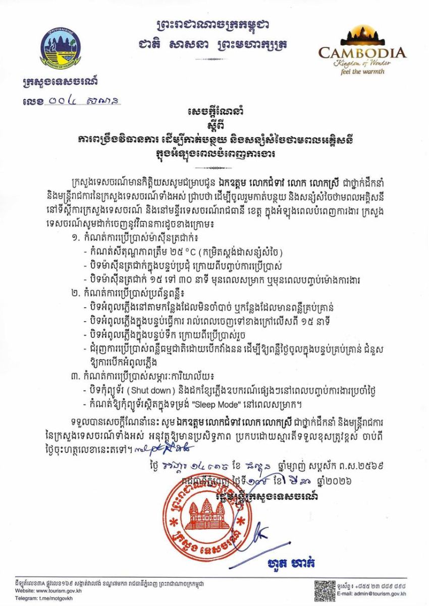 សេចក្តីណែនាំរបស់ក្រសួង ស្តីពីការពង្រឹងវិធានការ ដើម្បីកាត់បន្ថយ និងសន្សំសំចៃថាមពលអគ្គិសនីក្នុងអំឡុងពេលបំពេញការងារ បានផ្សាយនៅព្រឹកថ្ងៃទី១៨ មីនានេះ បញ្ជាក់ថា មន្ត្រីរាជការនៃក្រសួងទេសចរណ៍ទាំងអស់ត្រូវចូលរួមកាត់បន្ថយ និងសន្សំសំចៃថាមពលអគ្គិសនី ក្នុងអំឡុងពេលបំពេញ។