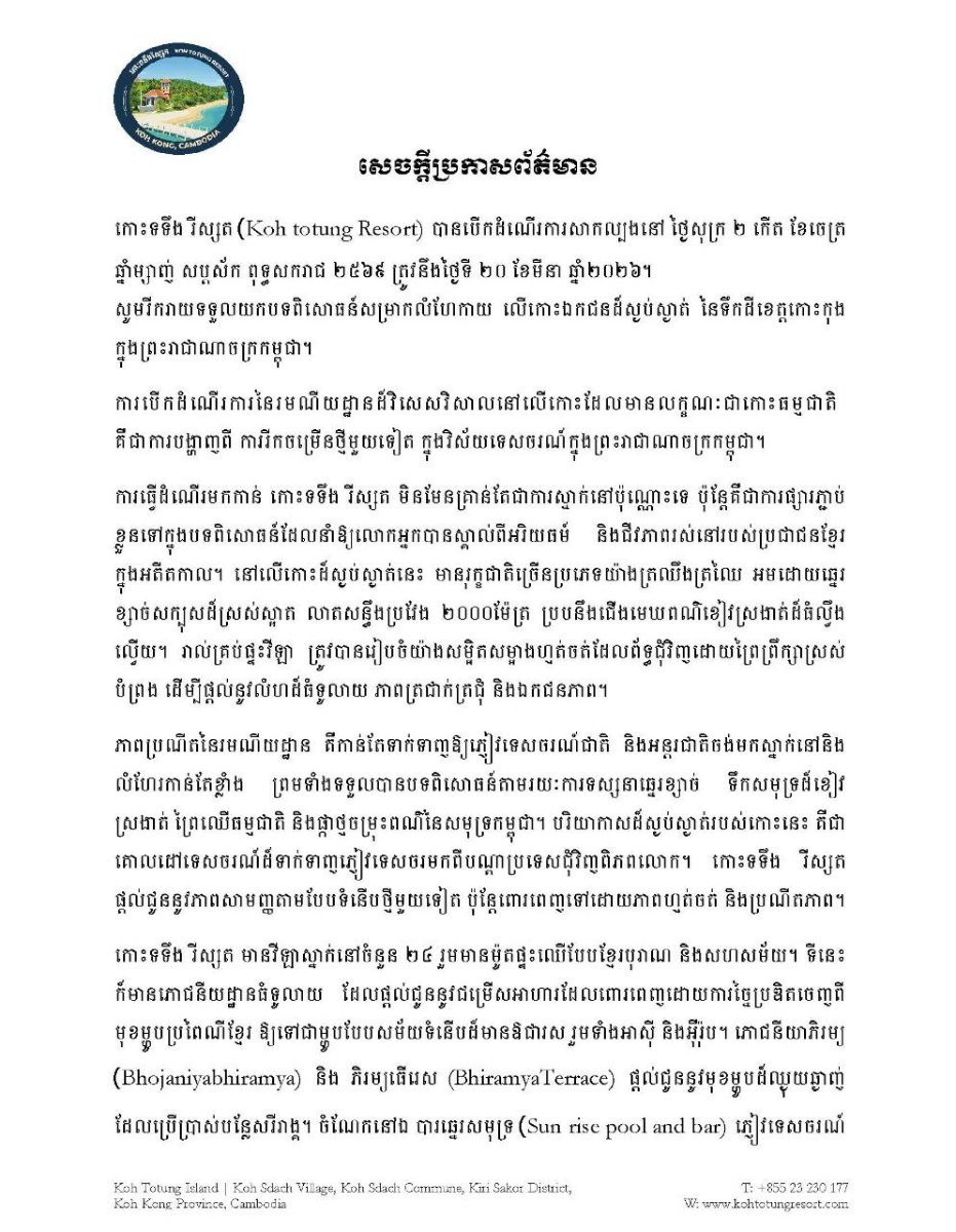 កោះកុង៖ កោះទទឹង ស្ថិតក្នុងស្រុកគិរីសាគរ ខេត្តកោះកុង ត្រូវបានរៀបចំឲ្យក្លាយជាតំបន់ទេសចរណ៍ថ្មីមួយទៀត ដើម្បីជំរុញកំណើនទេសចរណ៍ ហើយចាប់ផ្ដើមឲ្យភ្ញៀវទេសចរទៅសម្រាកលម្ហែកាយបានចាប់ពីថ្ងៃទី២០ ខែមីនា ឆ្នាំ២០២៦។