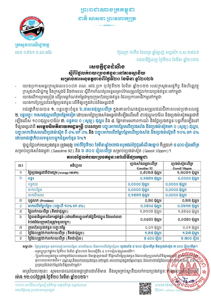 ភ្នំពេញ៖ ក្រសួងពាណិជ្ជកម្មកម្ពុជា បានចេញសេចក្ដីជូនដំណឹងថ្មី ស្តីពីថ្លៃលក់រាយប្រេងឥន្ធនៈនៅតាមស្ថានីយ សម្រាប់ការអនុវត្តចាប់ពីថ្ងៃទី២០ ខែមីនា ឆ្នាំ២០២៦នេះ ដោយបានកំណត់ ថ្លៃលក់រាយប្រេងឥន្ធនៈនៅតាមស្ថានីយនានាក្នុងប្រទេសកម្ពុជា ចាប់ពីថ្ងៃទី២០ មីនា សាំងធម្មតា ៥ ៤០០ រៀល/លីត្រ និងម៉ាស៊ូត ៦ ៧០០ រៀល/លីត្រ។