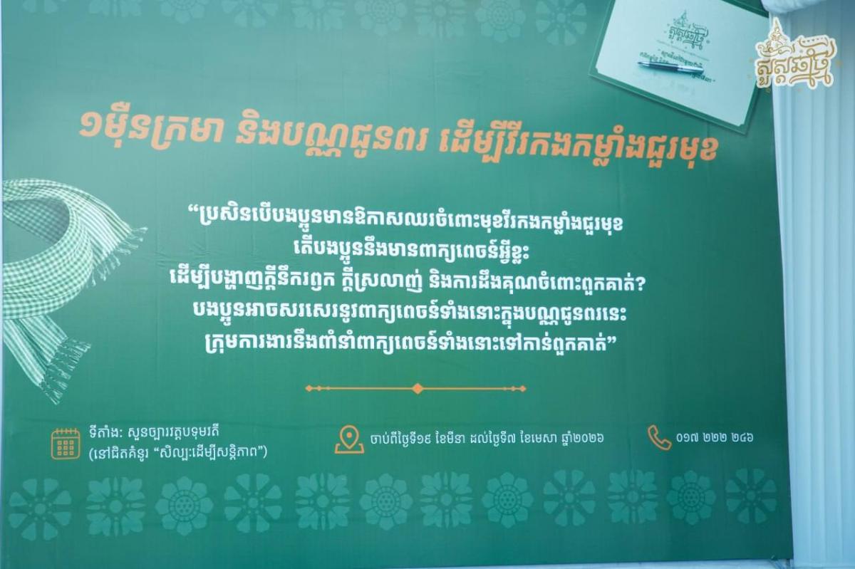 ពិធីទទួលការបរិច្ចាគក្រមាពីពលរដ្ឋទាំងអស់គ្នា បច្ចុប្បន្នបាននឹងកំពុងធ្វើឡើងនៅទីតាំងសិល្បៈដើម្បីសន្តិភាព នៅសួនច្បារវត្តបុទុមវត្តី ចាប់ពីថ្ងៃទី១៩ ខែមីនា រហូតដល់ថ្ងៃទី៧ ខែមេសា ឆ្នាំ២០២៦ ចាប់ពីម៉ោង៤:៣០នាទីរសៀល ដល់ម៉ោង៨:៣០យប់៕ អត្ថបទ៖ ស៊ុម សុខជា