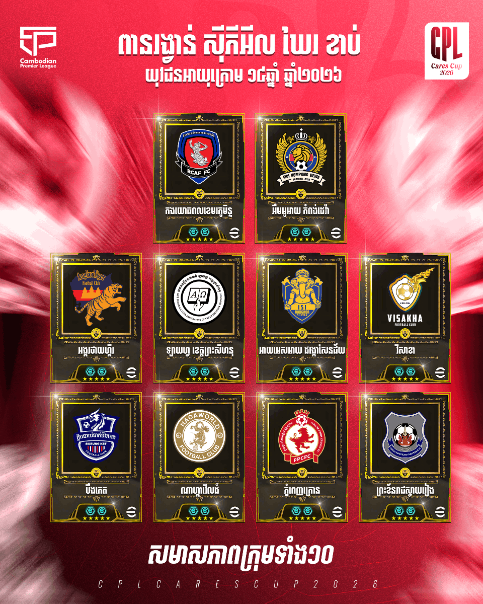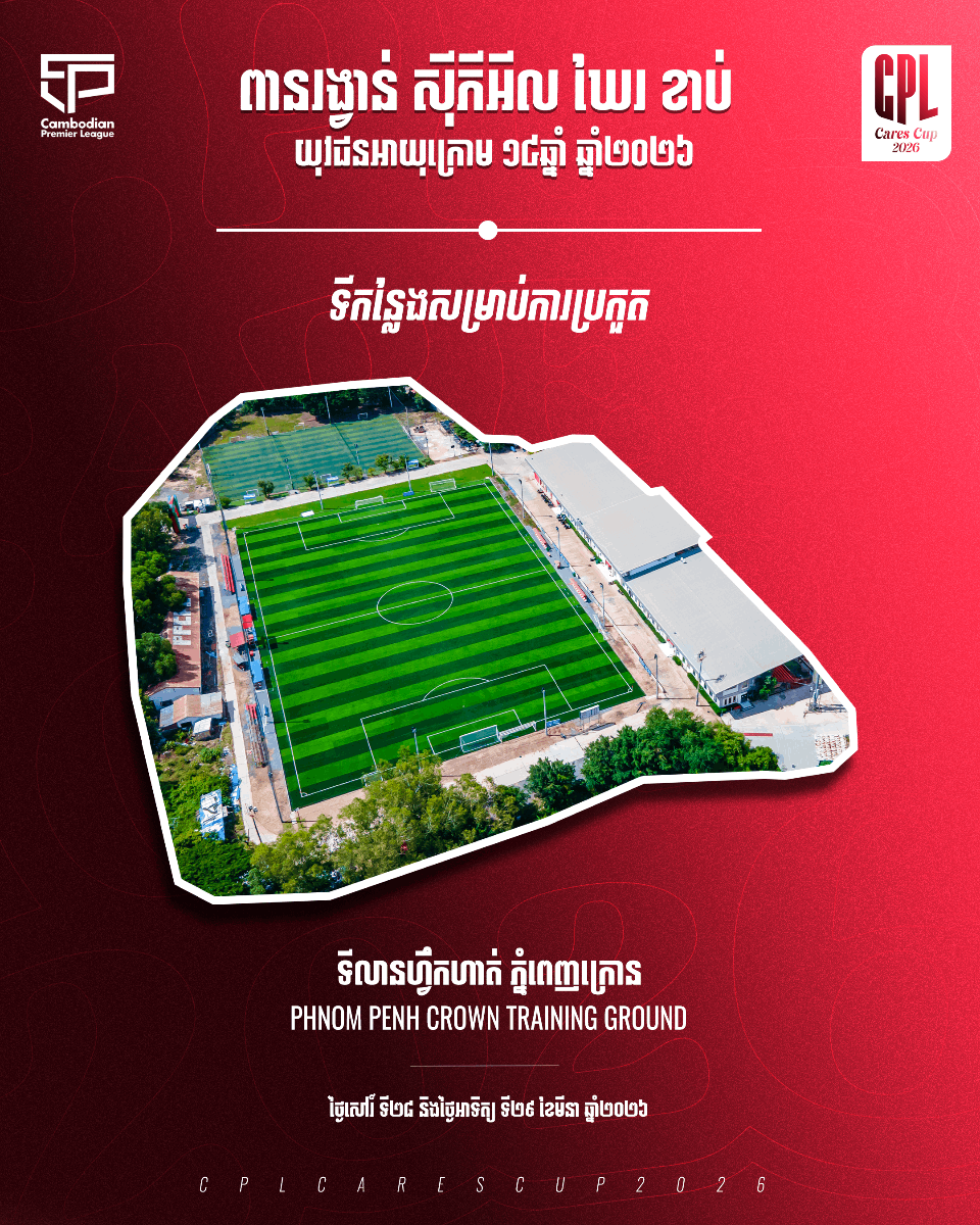 ក្រុមហ៊ុនខេមបូឌានព្រីមៀរលីគ(CPL) នឹងរៀបចំការប្រកួត​បាល់ទាត់​ពាន​រង្វាន់​យុវជន​អាយុ​ក្រោម ​១៤ឆ្នាំ ឬ CPL Cares Cup U-14 ឆ្នាំ២០២៦ នាថ្ងៃទី២៨-២៩ ខែមីនាចុងសប្ដាហ៍នេះ នៅ​ទីលានហ្វឹកហាត់ភ្នំពេញក្រោន ដោយមានក្រុមយុវជន នៃក្លិបសមាជិកលីគកំពូលកម្ពុជាចំនួន ១០​ក្រុមចូលរួម។