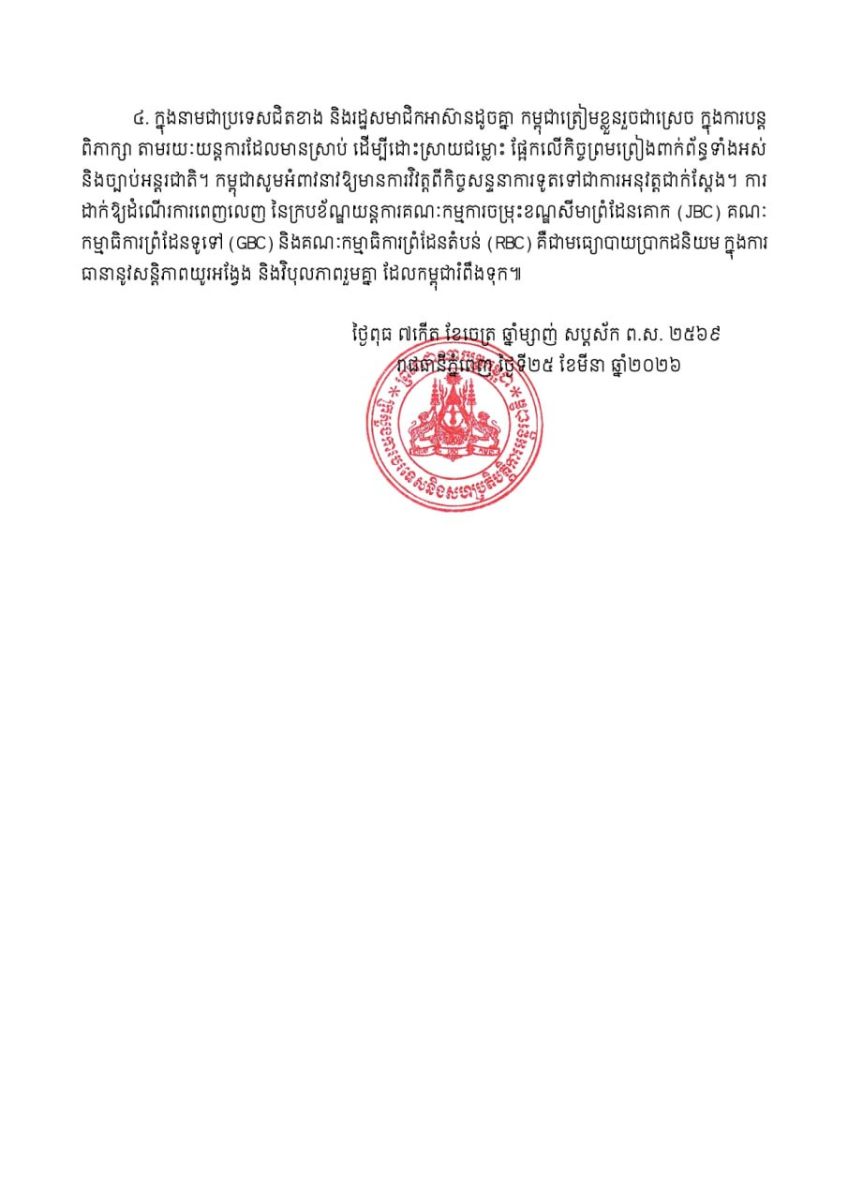 ៤. ក្នុងនាមជាប្រទេសជិតខាង និងរដ្ឋសមាជិកអាស៊ានដូចគ្នា កម្ពុជាត្រៀមខ្លួនរួចជាស្រេច ក្នុងការបន្តពិភាក្សា តាមរយៈយន្តការដែលមានស្រាប់ ដើម្បីដោះស្រាយជម្លោះ ផ្អែកលើកិច្ចព្រមព្រៀងពាក់ព័ន្ធទាំងអស់ និងច្បាប់អន្តរជាតិ។ កម្ពុជាសូមអំពាវនាវឱ្យមានការវិវត្តពីកិច្ចសន្ទនាការ ទូតទៅជាការអនុវត្តជាក់ស្ដែង៕