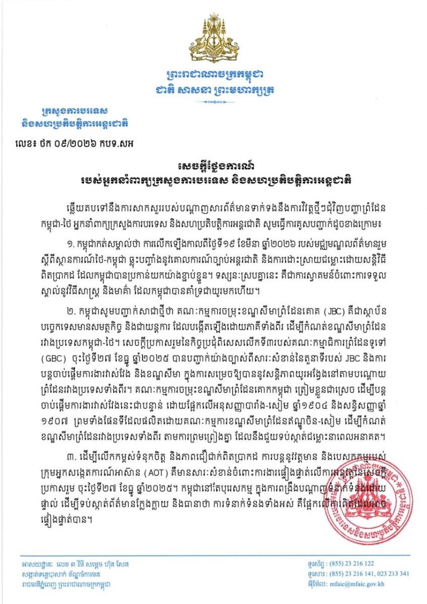 ១. កម្ពុជាកត់សម្គាល់ថា ការលើកឡើងកាលពីថ្ងៃទី១៩ ខែមីនា ឆ្នាំ២០២៦ របស់មជ្ឈមណ្ឌលព័ត៌មានរួម ស្តីពីស្ថានការណ៍ថៃ-កម្ពុជា ឆ្លុះបញ្ចាំងនូវគោលការណ៍ច្បាប់អន្តរជាតិ និងការដោះស្រាយជម្លោះដោយសន្តិវិធីពិតប្រាកដ ដែលកម្ពុជាបានប្រកាន់យកយ៉ាងខ្ជាប់ខ្ជួន។ ទស្សនៈស្របគ្នានេះ គឺជាការស្វាគមន៍ចំពោះការទទួលស្គាល់នូវវិធីសាស្ត្រ និងមាគ៌ា ដែលកម្ពុជាបានគាំទ្រជាយូរមកហើយ។