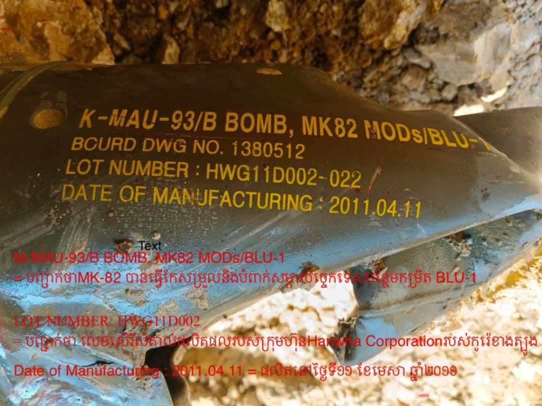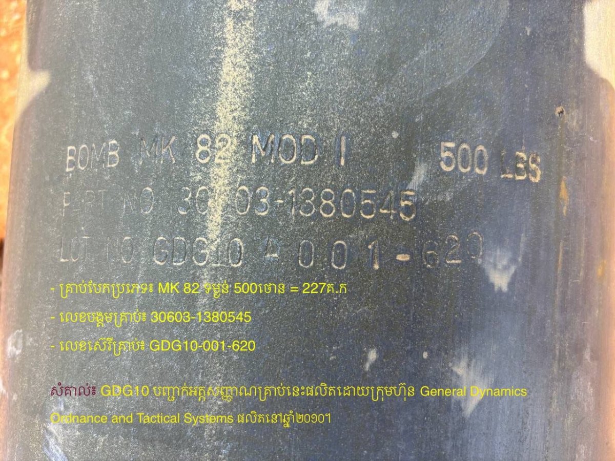 ឯកឧត្តមបានឱ្យដឹងថា គ្រាប់បែកទម្លាក់ពីយន្តហោះ MK-82 ផលិតនៅឆ្នាំ២០១០ ដោយក្រុមហ៊ុន GDG (General Dynamics Ordnance and Tactical Systems) និងបានកែសម្រួលបំពាក់បន្ថែមសម្ភារបច្ចេកទេសរបស់ក្រុមហ៊ុនកូរ៉េខាងត្បូង HWG(Hanwha Corporation)និងបានទម្លាក់លើមាតុភូមិកម្ពុជាដោយទ័ពអាកាសសៀមឈ្លានពាននៅថ្ងៃទី១០ ខែធ្នូ ឆ្នាំ២០២៥ វេលាម៉ោងប្រមាណ៤រសៀល។