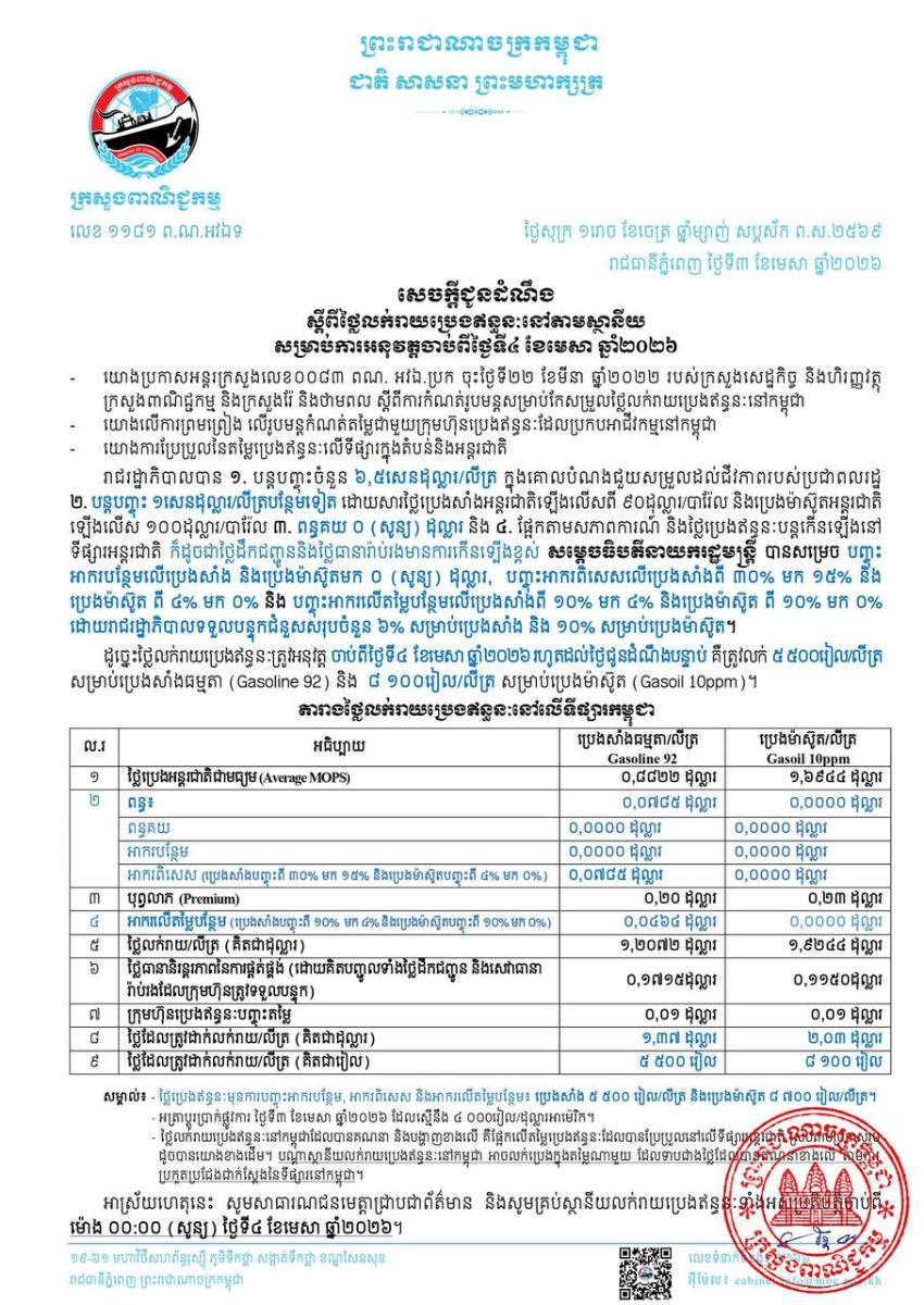តមសេចក្តីជូនដំណឹងរបស់ក្រសួងពាណិជ្ជកម្ម ស្តីពីថ្លៃលក់រាយប្រេងឥន្ធនៈនៅតាមស្ថានីយ សម្រាប់ការអនុវត្តចាប់ពីម៉ោង ០០:០០ (សូន្យ) ថ្ងៃទី៤ ខែមេសា ឆ្នាំ២០២៦ ក្នុងនោះតម្លៃប្រេងសាំង ៥ ៥០០ រៀល/លីត្រ និងប្រេងម៉ាស៊ូត ៨ ១០០ រៀល/លីត្រ។