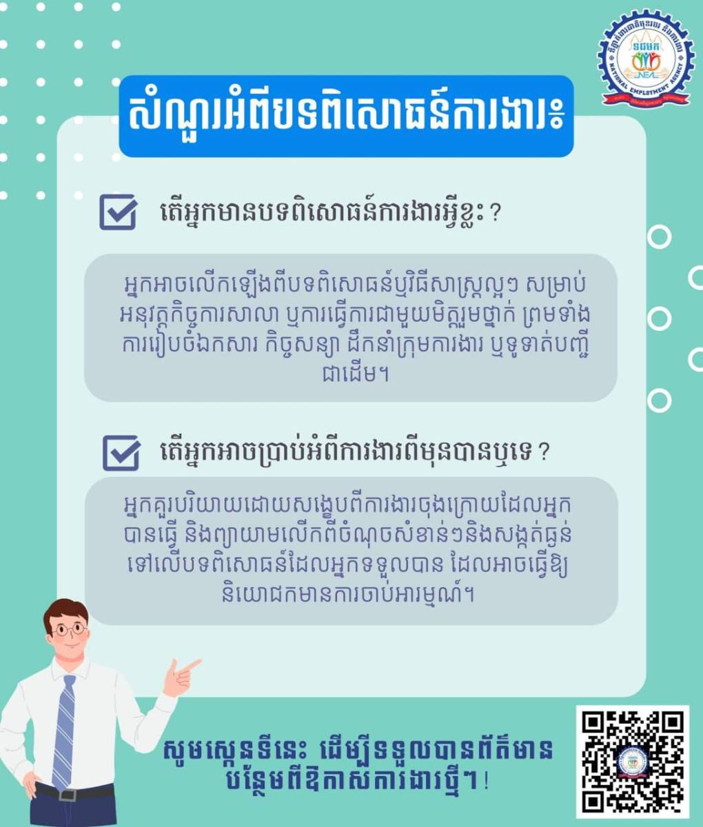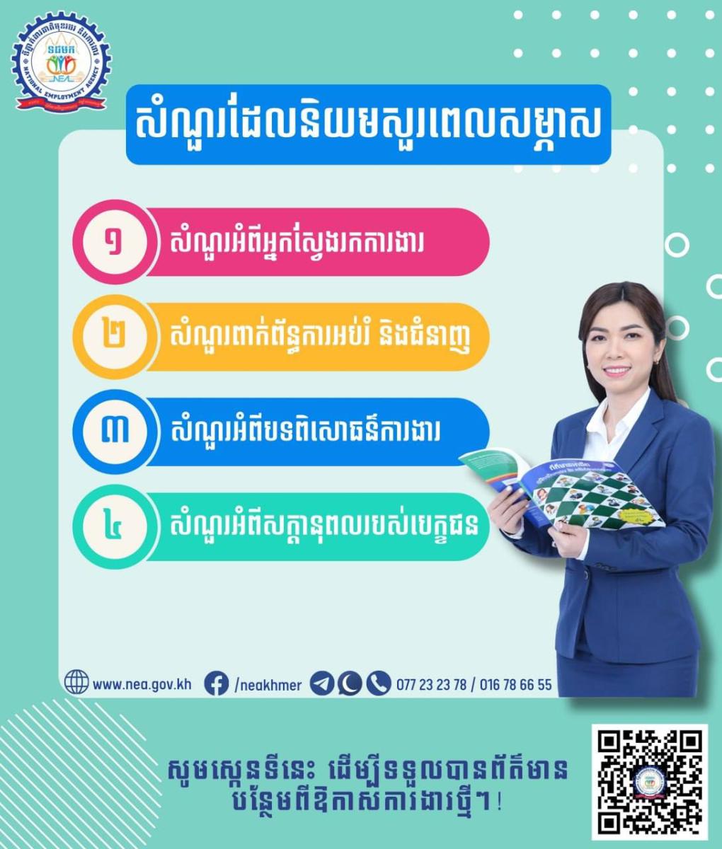 យោងតាមក្រសួងការងារ និងបណ្តុះបណ្តាលវិជ្ជាជីវៈ បច្ចុប្បន្ននេះឱកាសការងារចំនួនជាង ៩ម៉ឺនកន្លែង នៅតាមរាជធានី-ខេត្ត កំពុងរង់ចាំអ្នកកំពុងស្វែងរកការងារធ្វើ ជាពិសេសអតីតពលករ ដែលវិលត្រឡប់មកកម្ពុជាវិញ។ សម្រាប់ព័ត៌មានការងារ