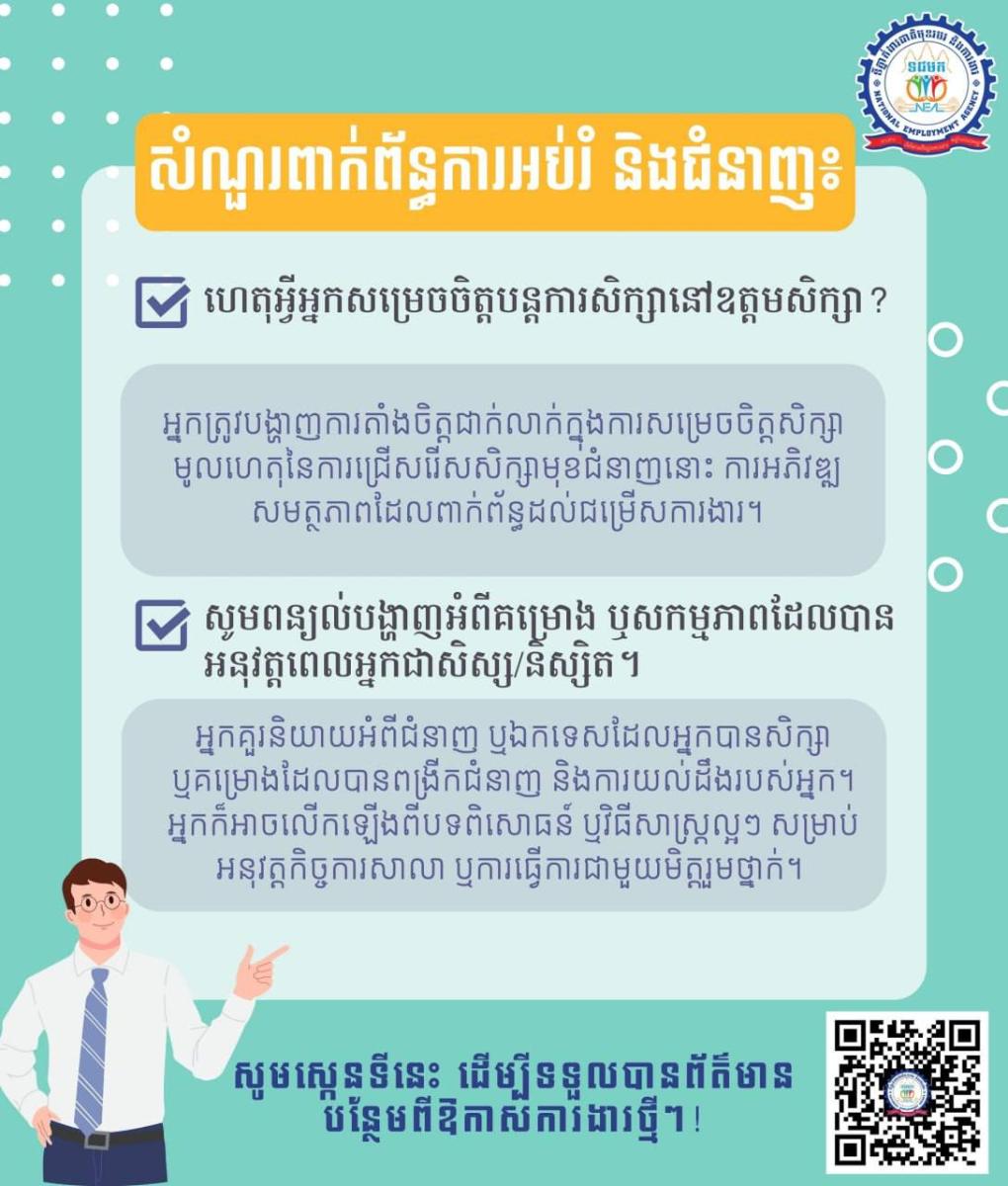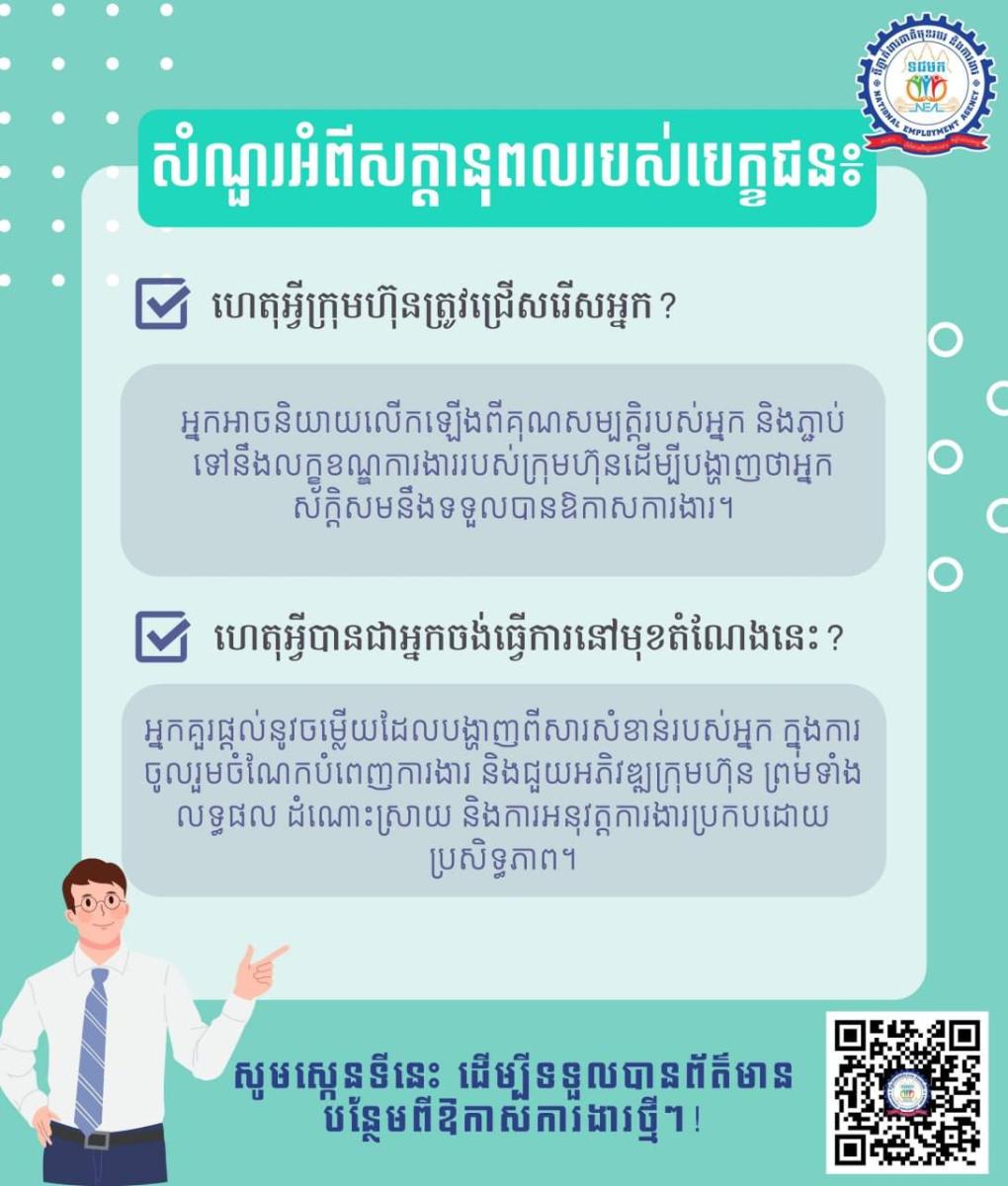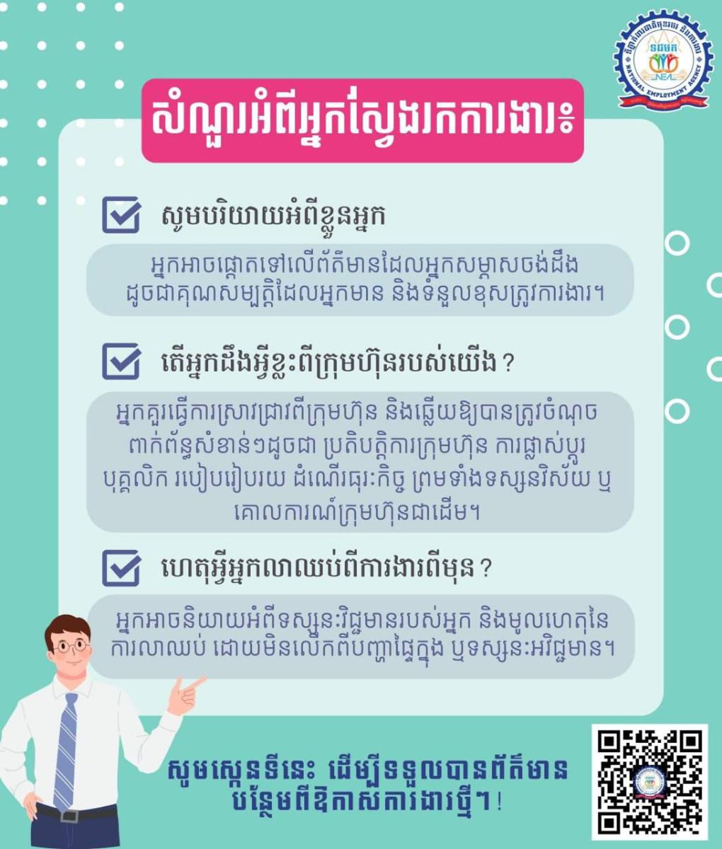 ក្នុងបទសម្ភាសន៍ជាមួយព័ត៌មាន ប៊ីធីវី លោក ឆោម សុខឿន ប្រធានមជ្ឈមណ្ឌលការងាររាជធានីភ្នំពេញ នៃទីភ្នាក់ងារជាតិមុខរបរ និងការងារ បានលើកឡើងឱ្យដឹងថា ការត្រៀមខ្លួនចូលទីផ្សារការងារ គឺជារឿងសំខាន់ ចាំបាច់ ដែលយុវជន និងអ្នកស្វែងរកការងារ ជាពិសេសចំពោះអ្នកដែលធ្លាប់មានបទពិសោធន៍ ត្រូវសិក្សាពីខ្លួនឯងពីវិស័យ ពីស្ថាប័ន ដោយសួរថាតើយើងចង់អភិវឌ្ឍសមត្ថភាពរបស់យើង ឬចង់ផ្លាស់ប្តូរខ្លួនយើងក្នុងវិស័យណាមួយជាដើម។