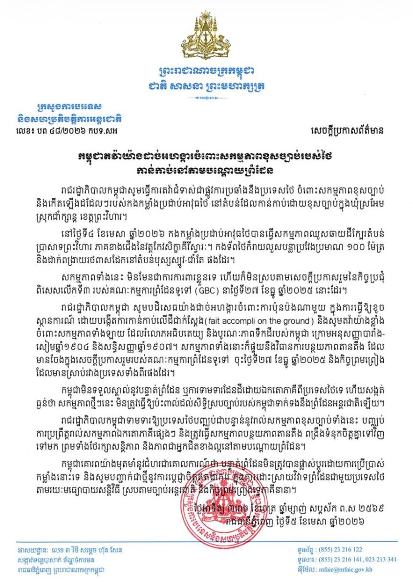 រាជរដ្ឋាភិបាលកម្ពុជាប្រកាសធ្វើការតវ៉ាជំទាស់ជាផ្លូវការប្រឆាំងនឹងប្រទេសថៃ ចំពោះសកម្មភាពខុសច្បាប់ និងកើតឡើងដដែលៗរបស់កងកម្លាំងប្រដាប់អាវុធថៃ នៅតំបន់ដែលកាន់កាប់ដោយខុសច្បាប់ក្នុងឃុំស្រអែម ស្រុកជាំក្សាន្ត ខេត្តព្រះវិហារ។ នេះបើយោងតាមសេចក្ដីប្រកាសព័ត៌មានរបស់ក្រសួងការបរទេស និងសហប្រតិបត្តិការអន្តរជាតិកម្ពុជានៅថ្ងៃទី៥ ខែមេសា ឆ្នាំ២០២៦នេះ។