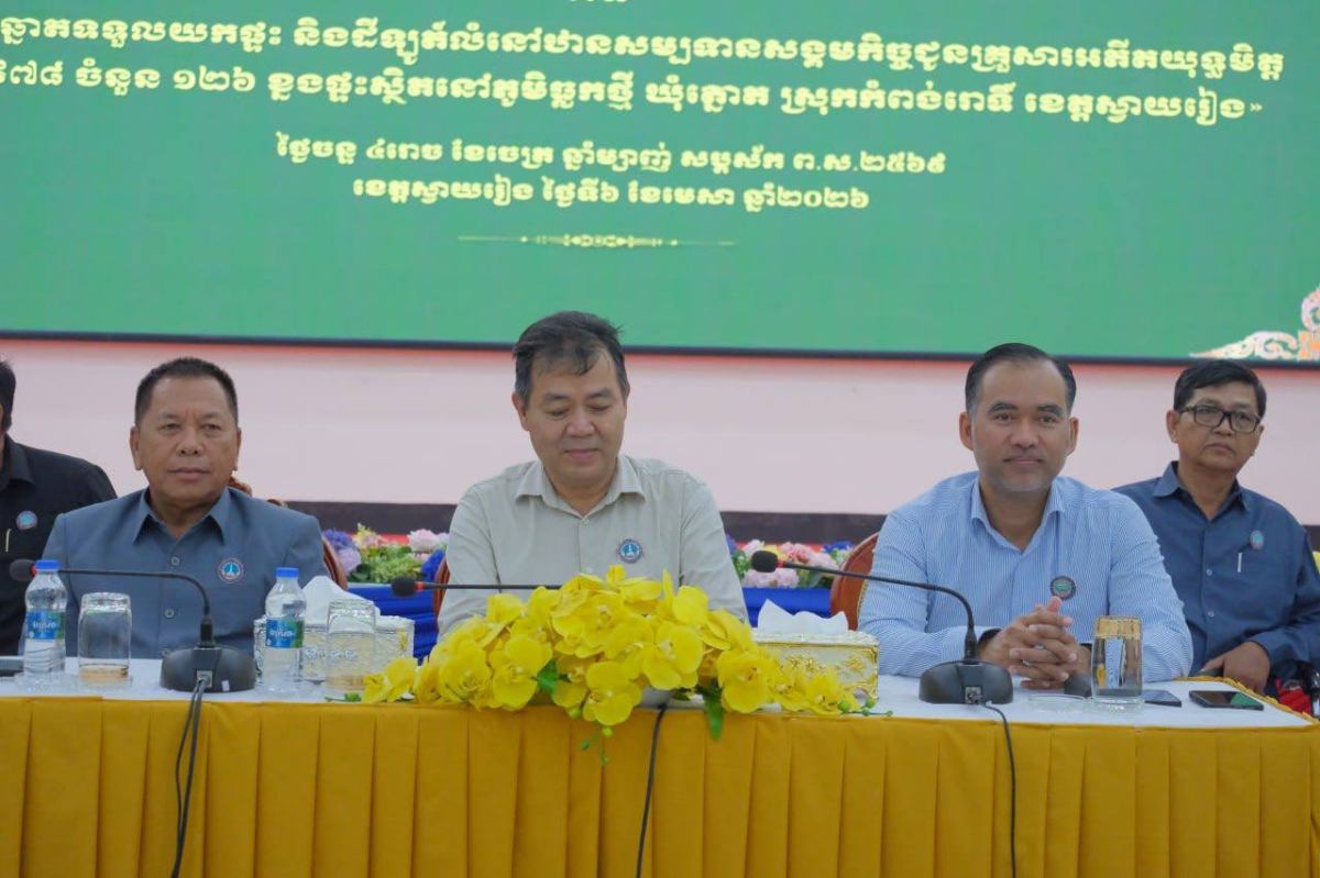 នាព្រឹកថ្ងៃទី ៦ ខែមេសា ឆ្នាំ ២០២៦ ឯកឧត្តម ប្រាក់ អង្គារ៉ា អគ្គនាយកនៃអគ្គនាយកដ្ឋានលំនៅដ្ឋាននៃក្រសួងរៀបចំដែនដីនគរូបនីយកម្ម សំណង់ និងសុរិយោដី បានអញ្ជើញជាអធិបតីភាពនៅក្នុងពិធីចាប់ឆ្នោតទទួលយកផ្ទះ និងដីឡូលំនៅដ្ឋាន ដែលរាជរដ្ឋាភិបាលបានរៀបចំជូនគណៈយុទ្ធមិត្តបម្រើកងទ័ពឆ្នាំ១៩៧៨ ចំនួន១២៦ខ្នងផ្ទះ នៅលើដីសម្បទានសង្គមកិច្ចដែលមានទីតាំងស្ថិតនៅក្នុងភូមិធ្លកថ្មី ឃុំត្នោត ស្រុកកំពង់រោទិ៍ខេត្តស្វាយរៀង។ ពិធីចាប់ឆ្នោតប្រគល់លេខផ្ទះនេះបានធ្វើឡើងនៅសាលប្រជុំមន្ទីរសង្គមកិច្ចអតីតយុទ្ធជន និងយុវនីតិសម្បទា ខេត្តស្វាយរៀង ដោយមានការអញ្ជើញចូលរួមពី ឯកឧត្តម អ៊ុ សុខ អគ្គលេខាធិការរងសមាគម និងលោក ម៉ែន អេង អភិបាលរងខេត្តស្វាយរៀង ព្រមទាំងគ្រួសារគណៈយុទ្ធមិត្តបម្រើកងទ័ពឆ្នាំ១៩៧៨ ទាំង១២៦គ្រួសារ៕
