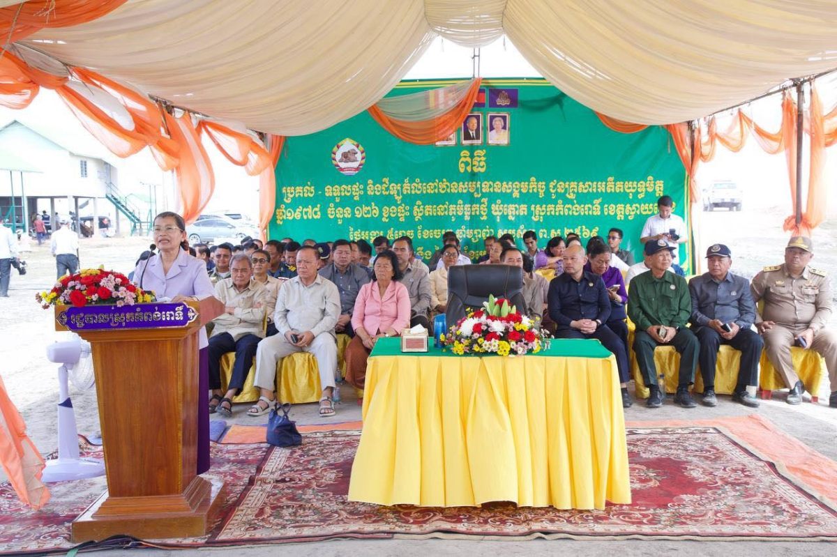 សម្តេចកិត្តិសង្គហបណ្ឌិត ម៉ែន សំអន ប្រធានគណៈយុទ្ធមិត្តជំនាន់បម្រើកងទ័ពឆ្នាំ១៩៧៨ បានអញ្ជើញជាអធិបតីក្នុងពិធីប្រគល់-ទទួលផ្ទះ ដីឡូតិ៍លំនៅដ្ឋានសម្បទានសង្គមកិច្ចជូនគ្រួសារអតីតយុទ្ធមិត្តឆ្នាំ១៩៧៨ ចំនួន ១២៦ខ្នងផ្ទះ នៅភូមិធ្លកថ្មី ឃុំត្នោត ស្រុកកំពង់រោទិ៍ ខេត្តស្វាយរៀង នាព្រឹកថ្ងៃអង្គារ ៥រោច ខែចេត្រ ឆ្នាំម្សាញ់ សប្តស័ក ព.ស.២៥៦៩ ត្រូវនឹង ថ្ងៃទី៧ ខែមេសា ឆ្នាំ២០២៦។