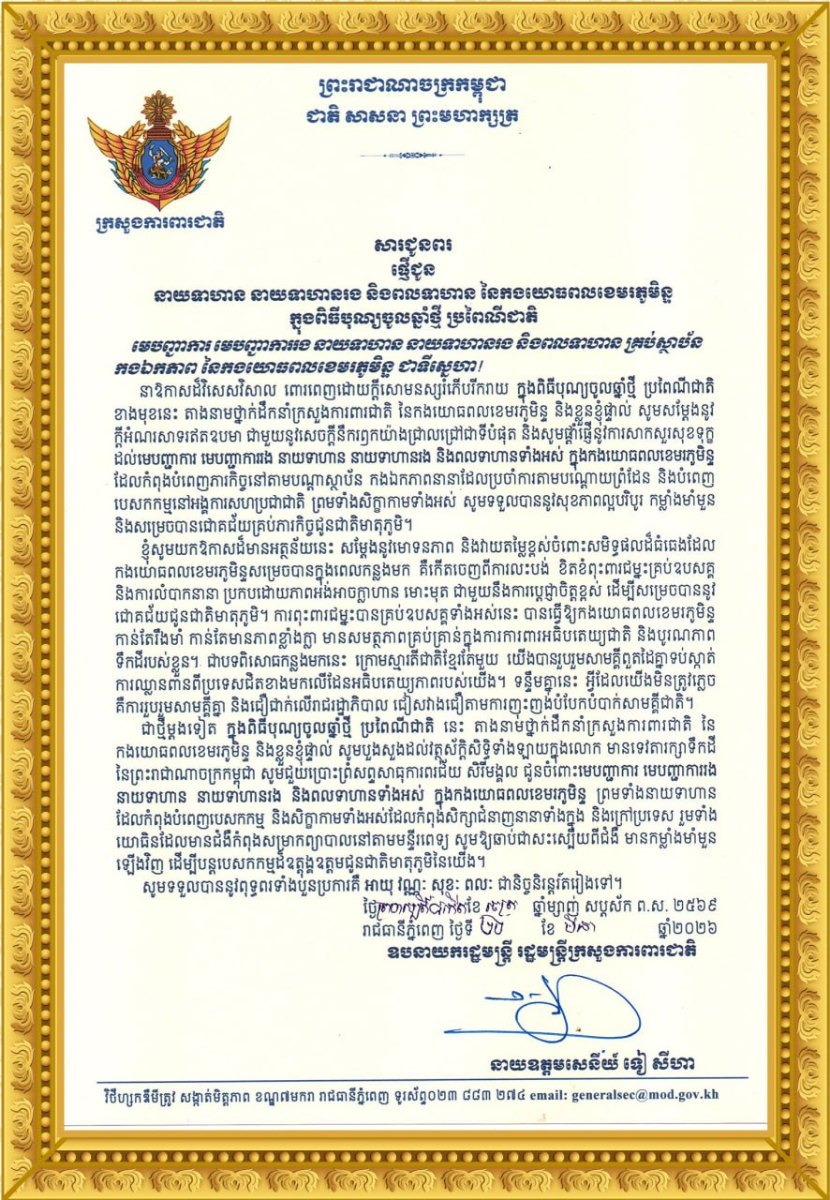 ក្នុងពិធីបុណ្យចូលឆ្នាំថ្មី ប្រពៃណីជាតិនេះ តាងនាមថ្នាក់ដឹកនាំក្រសួងការពារជាតិ និងកងយោធពលខេមរភូមិន្ទ ឯកឧត្តមនាយឧត្តមសេនីយ៍ប្រមុខការពារជាតិកម្ពុជា ក៏សូមបួងសួងដល់វត្ថុស័ក្តិសិទ្ធិទាំងឡាយក្នុងលោក មានទេវតារក្សាទឹកដី នៃព្រះរាជាណាចក្រកម្ពុជា សូមជួយប្រោះព្រំសព្ទសាធុការពរជ័យ សិរីមង្គល ជូនចំពោះមេបញ្ជាការ មេបញ្ជាការរង នាយទាហាន នាយទាហានរង និងពលទាហានទាំងអស់ ក្នុងកងយោធពលខេមរភូមិន្ទ ព្រមទាំងនាយទាហាន ដែលកំពុងបំពេញបេសកកម្ម និងសិក្ខាកាមទាំងអស់ដែលកំពុងសិក្សាជំនាញនានាទាំងក្នុង និងក្រៅប្រទេស រួមទាំងយោធិនដែលមានជំងឺកំពុងសម្រាកព្យាបាលនៅតាមមន្ទីរពេទ្យ សូមឱ្យឆាប់ជាសះស្បើយពីជំងឺមានកម្លាំងមាំមួន ឡើងវិញ ដើម្បីបន្តបេសកកម្មដ៏ឧត្តុង្គឧត្តមជូនជាតិមាតុភូមិនៃយើងផងដែរ។