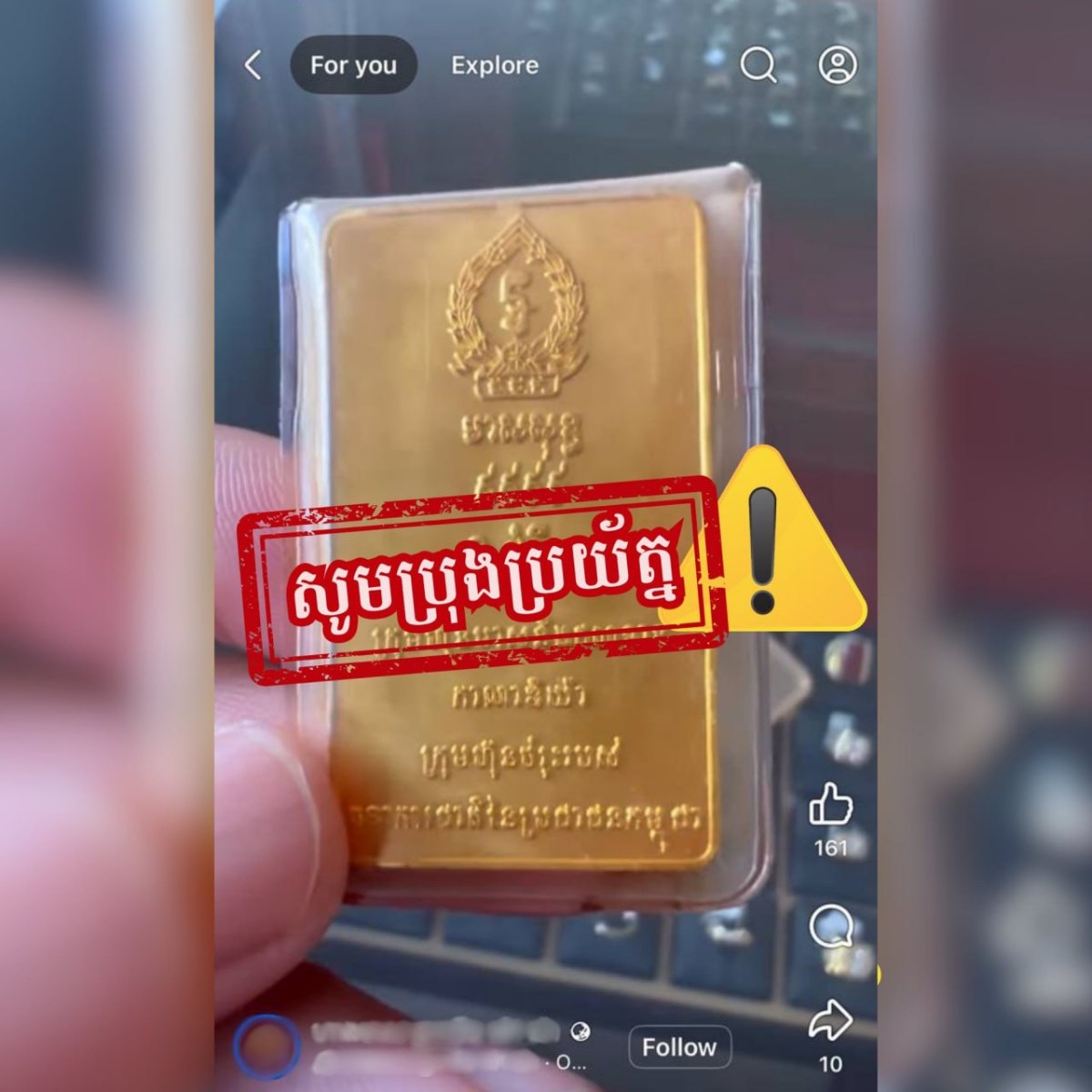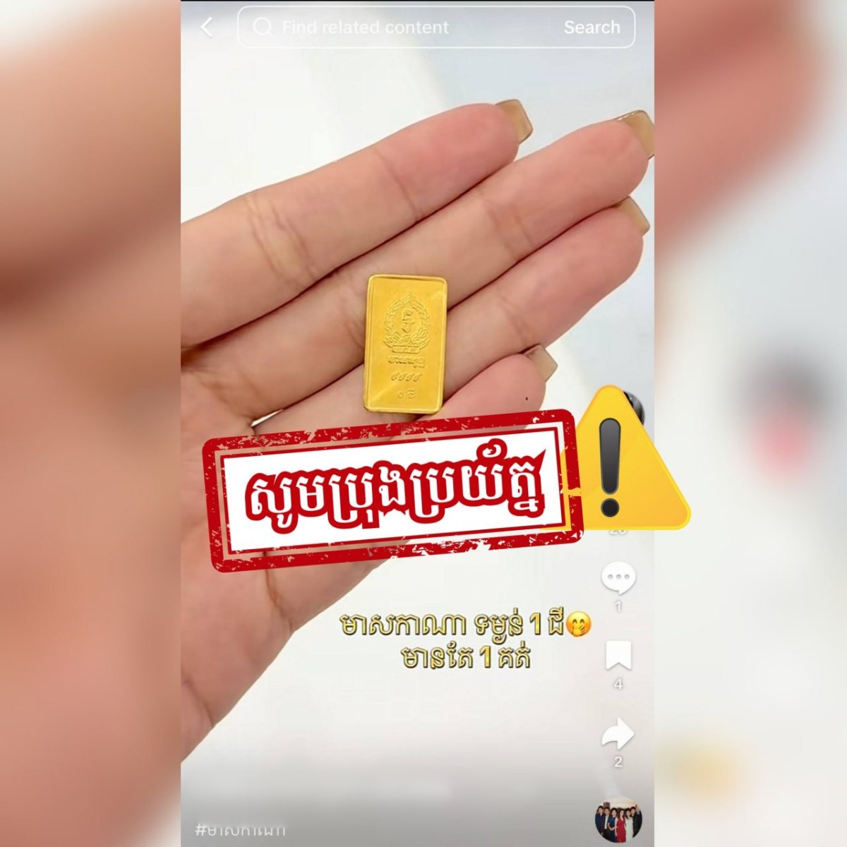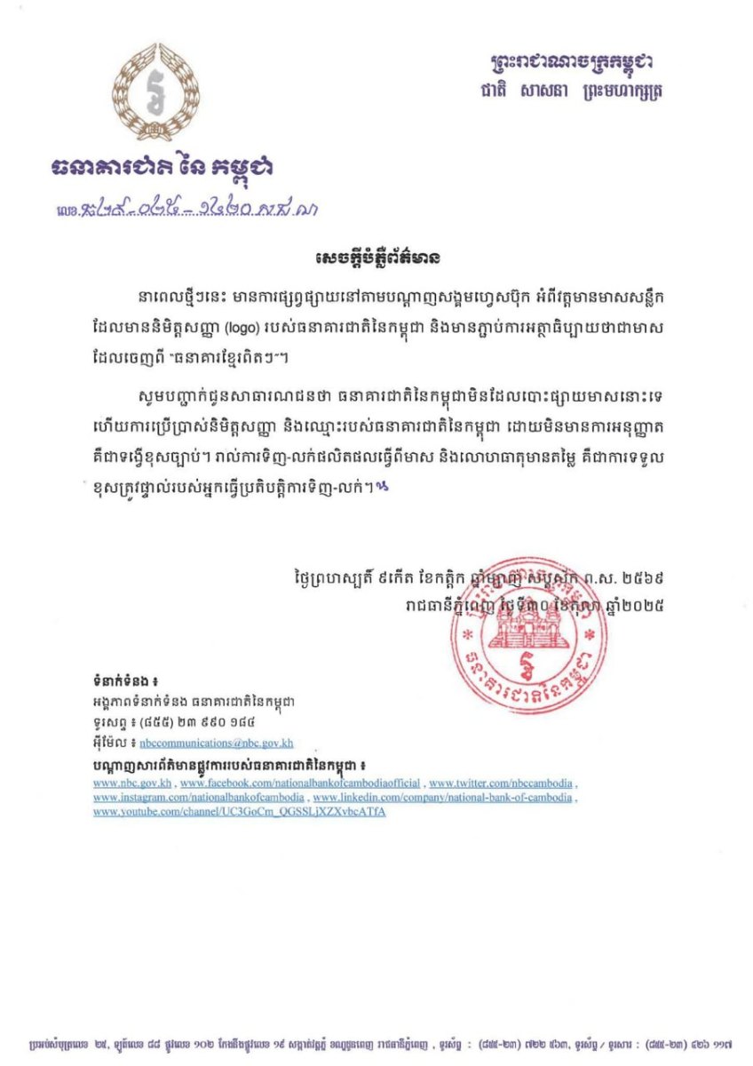 សូមបញ្ជាក់ជូនសាធារណជនថា ធនាគារជាតិនៃកម្ពុជាមិនដែលបោះផ្សាយមាសនោះទេ ហើយការប្រើប្រាស់និមិត្តសញ្ញា និងឈ្មោះរបស់ធនាគារជាតិនៃកម្ពុជា ដោយមិនមានការអនុញ្ញាត គឺជាទង្វើខុសច្បាប់។