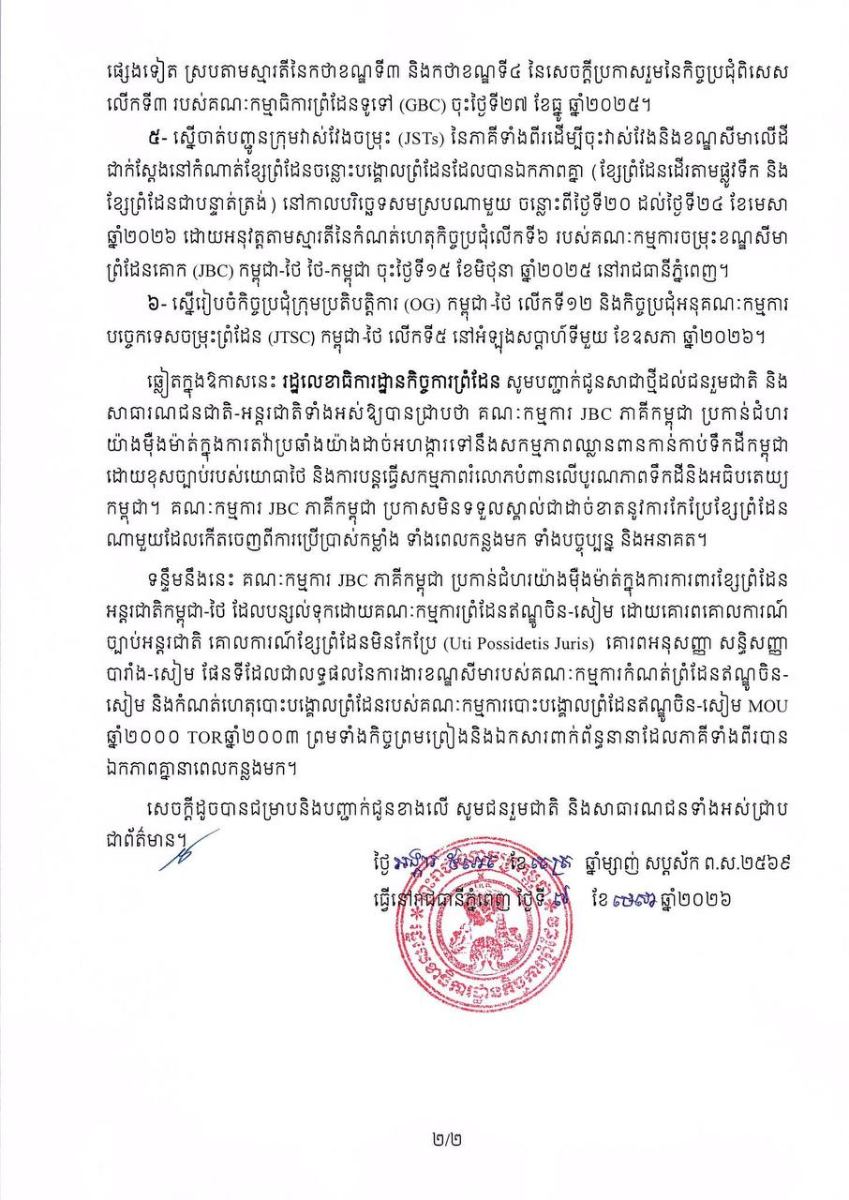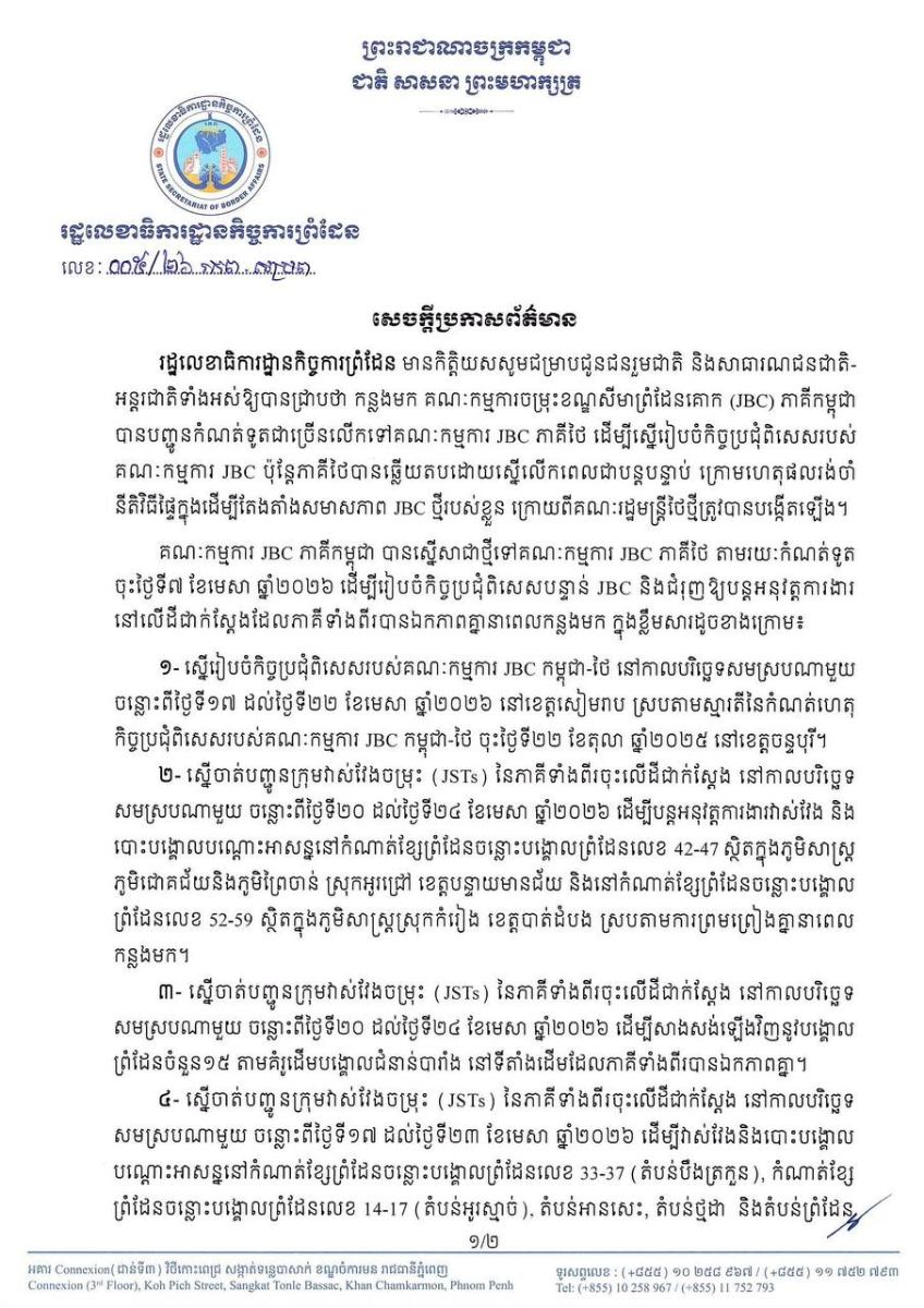 គណៈកម្មការ JBC ភាគីកម្ពុជា បានស្នើសាជាថ្មីទៅគណៈកម្មការ JBC ភាគីថៃ តាមរយៈកំណត់ទូត ចុះថ្ងៃទី៧ ខែមេសា ឆ្នាំ២០២៦ ដើម្បីរៀបចំកិច្ចប្រជុំពិសេសបន្ទាន់ JBC និងជំរុញឱ្យបន្តអនុវត្តការងារ នៅលើដីជាក់ស្តែងដែលភាគីទាំងពីរបានឯកភាពគ្នា នាពេលកន្លងមក ក្នុងខ្លឹមសារដូចខាងក្រោម៖