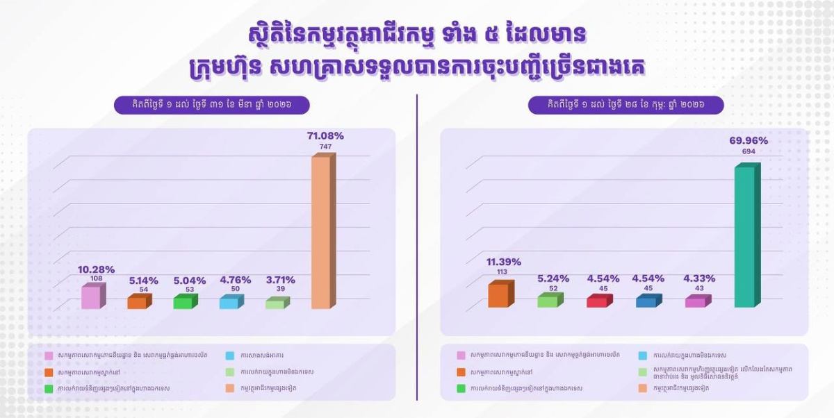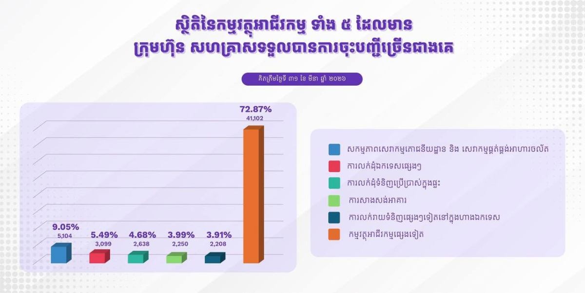 ចំពោះក្រុមហ៊ុននិងសហគ្រាស ដែលទទួលបានចុះបញ្ជីច្រើនជាងគេក្នុងខែមីនានេះរួមមាន៖ សកម្មភាពសេវាភោជនីយ ដ្ឋាន និងសេវាផ្គត់ផ្គង់សេវាចល័តមានចំនួនជាង ៥ ពាន់សហគ្រាស, ការលក់ដុំឯកទេសផ្សេងៗជិត ៤ ពាន់សហគ្រាស, ការលក់ដុំទំនិញ សម្រាប់ការប្រើប្រាស់ក្នុងផ្ទះជាង ២,៦ ពាន់សហគ្រាស, ការសាងសង់អគារជាង ២,២ ពាន់ក្រុមហ៊ុន, ការលក់រាយទំនិញ ផ្សេងៗនៅ ក្នុងហាងឯកទេសជាង ២,២ ពាន់សហគ្រាស និងអាជីវកម្មផ្សេងៗមានចំនួនជាង ៤១ ក្រុមហ៊ុន/សហគ្រាស៕ អត្ថបទ៖ សុន រ៉ាឌី