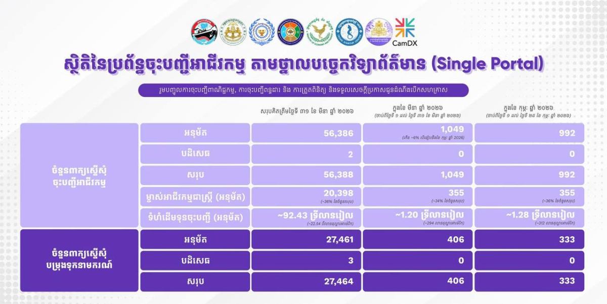 យោងតាមសេចក្ដីប្រកាសព័ត៌មានរួម នៃប្រព័ន្ធចុះបញ្ជីអាជីវកម្មតាមថ្នាលបច្ចេកវិទ្យាព័ត៌មាន ហៅកាត់ថា CamDX ជាថ្នាល បច្ចេកវិទ្យាឌីជីថលមួយ សម្រាប់សម្រួលដល់កិច្ចការវិនិយោគរបស់រាជរដ្ឋាភិបាល បានបង្ហាញឱ្យដឹងថា នៅក្នុងខែមីនា ឆ្នាំ២០២៦ កន្លងមកនេះ កម្ពុជាទទួលបានការចុះបញ្ជីតាម CamDX រួមមាន៖ ការចុះបញ្ជីពាណិជ្ជកម្ម, ការចុះបញ្ជីពន្ធដារ, ការត្រួតពិនិត្យ និងទទួលសេចក្តីប្រកាសជូនដំណឹងបើកសហគ្រាស ដែលបានអនុម័ត មានចំនួនសរុប ១.០៤៩ ក្រុមហ៊ុន/សហគ្រាស បើធៀបនិងខែ កុម្ភៈ បានកើនឡើង ៦ ភាគរយ មានទុនវិនិយោគសរុប ១,២ ទ្រីលានរៀល ត្រូវប្រមាណ ២៩៤ លានដុល្លារអាមេរិក ក្នុងនោះ អាជីវកម្មជាស្រ្តីមានចំនួន ៣៥៥ ក្រុមហ៊ុន/សហគ្រាស។