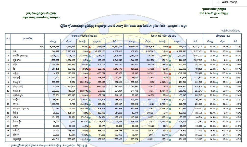 ទិន្នន័យដដែល បញ្ជាក់ទៀតថា ក្នុងនោះ កម្ពុជានាំចេញទំនិញមានតម្លៃជាប្រាក់ជាង ៨,០៩ ពាន់​លានដុល្លារអាម៉េរិក កើនឡើង ១៧,៧% ខណៈ​កម្ពុជា​នាំ​ចូល​ទំនិញ​មក​វិញ​មាន​តម្លៃ​ជា​ប្រាក់​ជាង ​៨,៨៣ ពាន់លានដុល្លារអាម៉េរិក កើនឡើង ១៦,៧%។