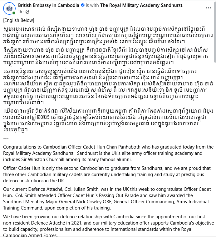 ស្ថានទូតអង់គ្លេស បានគូសបញ្ជាក់ថា អង់គ្លេសបានពង្រឹងទំនាក់ទំនងលើវិស័យការពារជាតិជាមួយកម្ពុជា តាំងពីការតែងតាំងសេនានុព័ន្ធយោធាដំបូងនៅឆ្នាំ២០២១ ហើយផ្ដល់ជូនកម្មវិធីអប់រំយោធា គាំទ្រដល់គោលបំណងរបស់កម្ពុជា ក្នុងការកសាងសមត្ថភាព វិជ្ជាជីវៈភាព និងការប្រកាន់ខ្ជាប់ស្តង់ដារអន្តរជាតិ នៅក្នុងជួរកងយោធពលខេមរភូមិន្ទ៕