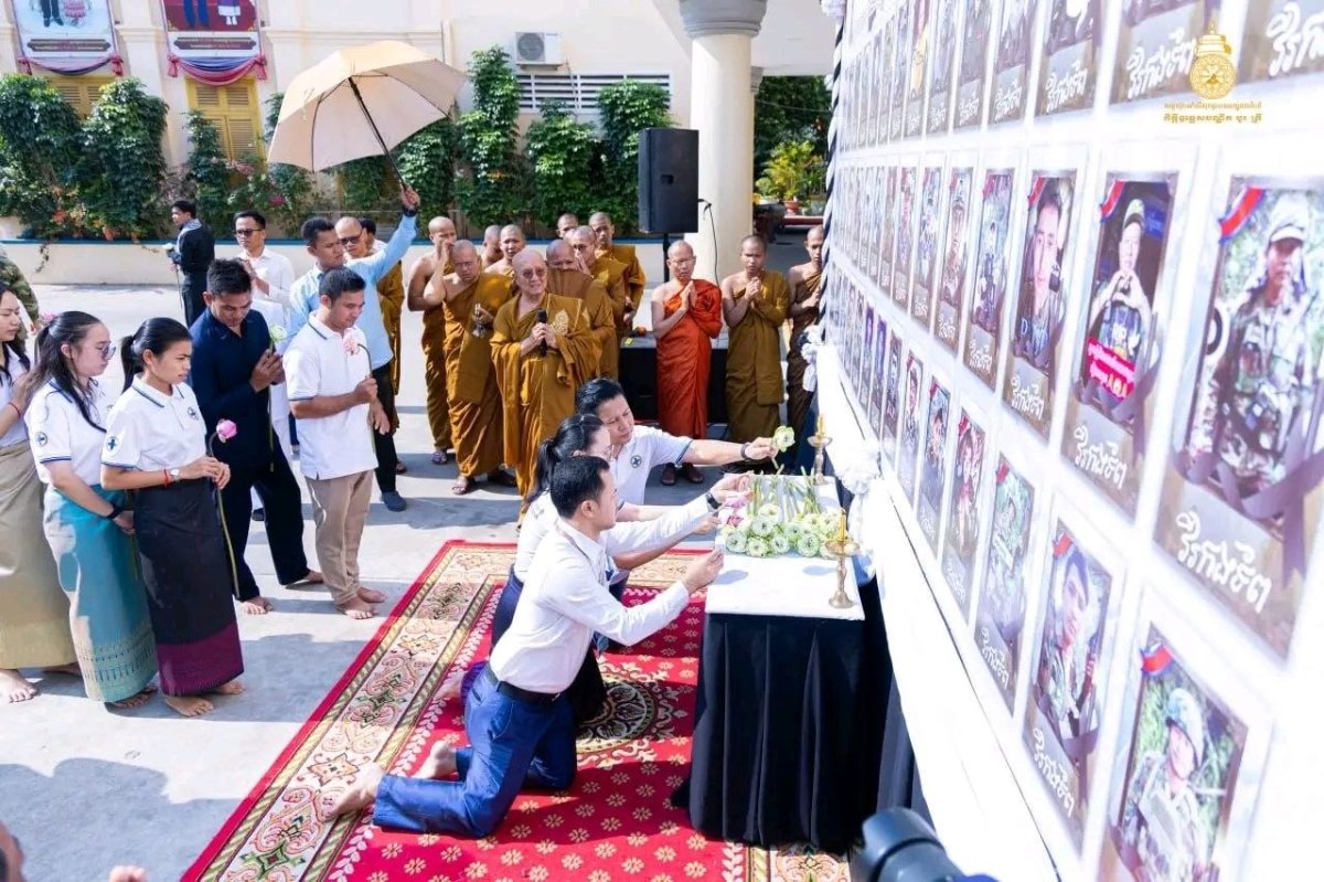 បន្ទាប់ពីរៀបចំពិធីបែបសាសនា រួច ឯកឧត្តម ងួន ស្តេចភក្តី រដ្ឋលេខាធិការទទួលបន្ទុកពុទ្ធិកសាកលវិទ្យាល័យព្រះសីហមុនីរាជា និងគណៈគ្រប់គ្រង ព្រះមន្ត្រីសង្ឃ មន្ត្រីរាជការ បុគ្គលិក សាស្ត្រាចារ្យ បានអញ្ជើញពិធីរាប់បាត្រ នមស្ការសមាទានសីល និងបង្សុកូល ឧទ្ទិសមហាកុសលដល់ដួងវិញ្ញាណក្ខន្ធបុព្វការីជន និងវិរៈកងទ័ពដ៏អង់អាចក្លាហានរបស់យើង ដែលបានពលីក្នុងបុព្វហេតុការពារបូរណភាពទឹកដីកម្ពុជា៕ អត្ថបទ បាន សុខរិទ្ធិ