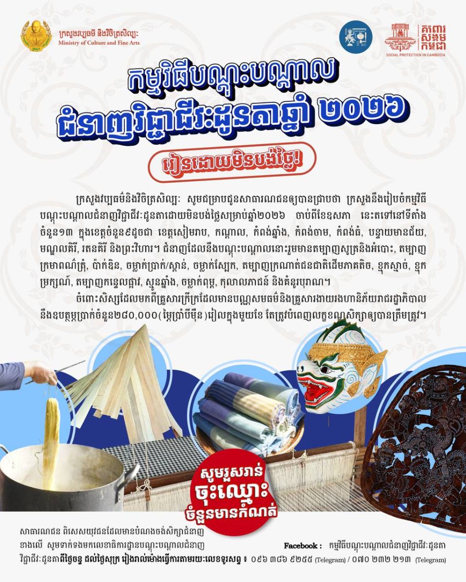 ក្រសួងវប្បធម៌ និងវិចិត្រសិល្បៈ ប្រកាសជ្រើសរើសសិស្សានុសិស្ស ដើម្បីចូលរួមកម្មវិធីបណ្តុះបណ្តាលជំនាញវិជ្ជាជីវៈដូនតា ដោយមិនបង់ថ្លៃ សម្រាប់ឆ្នាំ២០២៦ ចាប់ពីខែឧសភា នេះតទៅ។