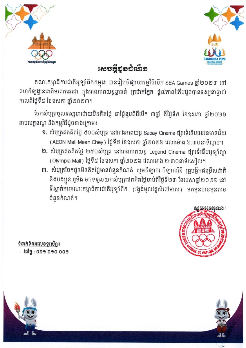 ទន្ទឹមជាមួយការចាក់បញ្ចាំងនូវពិធីបើកដ៏មហាអស្ចារ្យនេះដែរ គណៈកម្មាធិការជាតិអូឡាំពិកកម្ពុជា បានជូនដំណឹងអំពីការចែកសំបុត្រចូលទស្សនាដោយឥតគិតថ្លៃជាច្រើន សម្រាប់ខួបពិធីបើក ៣ឆ្នាំ គឺត្រូវនឹងថ្ងៃទី៥ ខែឧសភា ឆ្នាំ២០២៦ ក្នុងនោះរួមមាន៖ សំបុត្រទស្សនាឥតគិតថ្លៃ នៅរោងភាពយន្ត Sabay Cinema ផ្សារទំនើបអ៊ីអនមានជ័យចំនួន ៥០០សំបុត្រ, សំបុត្រទស្សនាឥតគិតថ្លៃ នៅរោងភាពយន្ត Legend Cinema នៅផ្សារទំនើបអូឡាំព្យា ចំនួន ២៥០សំបុត្រ និងសម្រាប់សំបុត្រចែកជូនឥតគិតថ្លៃមានចំនួនកំណត់ សម្រាប់កីឡាករ កីឡាការិនី គ្រូបង្វឹក និងសាច់ញាតិ ដែលត្រូវចែកជូនចាប់ពីថ្ងៃទី២៣ ខែមេសា ឆ្នាំ២០២៦ នៅទីស្នាក់ការគណៈកម្មាធិការជាតិអូឡាំពិកកម្ពុជា។