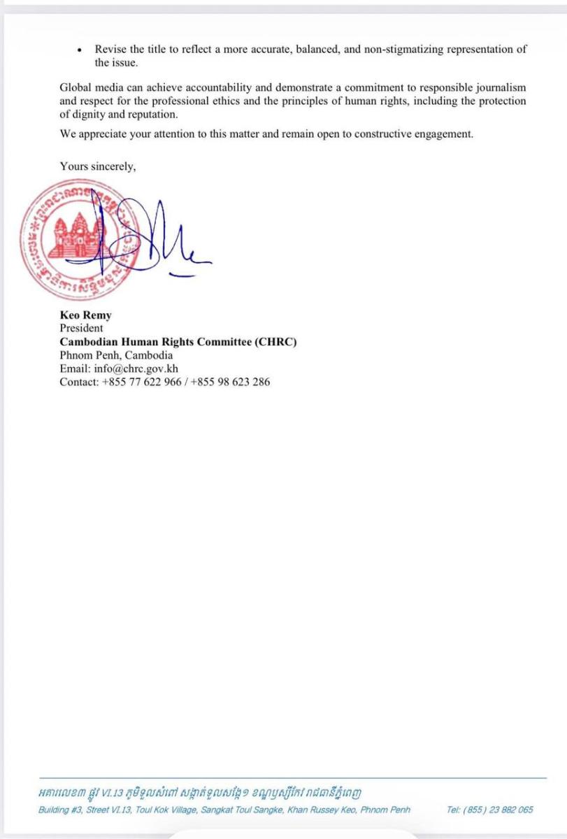 គណៈកម្មាធិការសិទ្ធិមនុស្សកម្ពុជាលើកឡើងថា នៅក្នុងអត្ថបទមួយរបស់សារព័ត៌មាន The Wall Street Journal កាលថ្ងៃទី១៩ ខែមេសា ឆ្នាំ២០២៦ ជាការបង្ហាញពីកង្វះវិជ្ជាជីវៈ និងក្រមសីលធម៌សារព័ត៌មាន ដែលអាចនាំឱ្យមានការយល់ច្រឡំ ការរើសអើង ព្រមទាំងប៉ះពាល់យ៉ាងធ្ងន់ធ្ងរដល់សិទ្ធិ សេចក្តីថ្លៃថ្នូរ និងកិត្តិយសប្រទេស និងប្រជាជនកម្ពុជា ជិត១៨លាននាក់ ដែលត្រូវបានធានាការពារដោយធម្មនុញ្ញអង្គការសហប្រជាជាតិ និងច្បាប់សិទ្ធិមនុស្សអន្តរជាតិ។