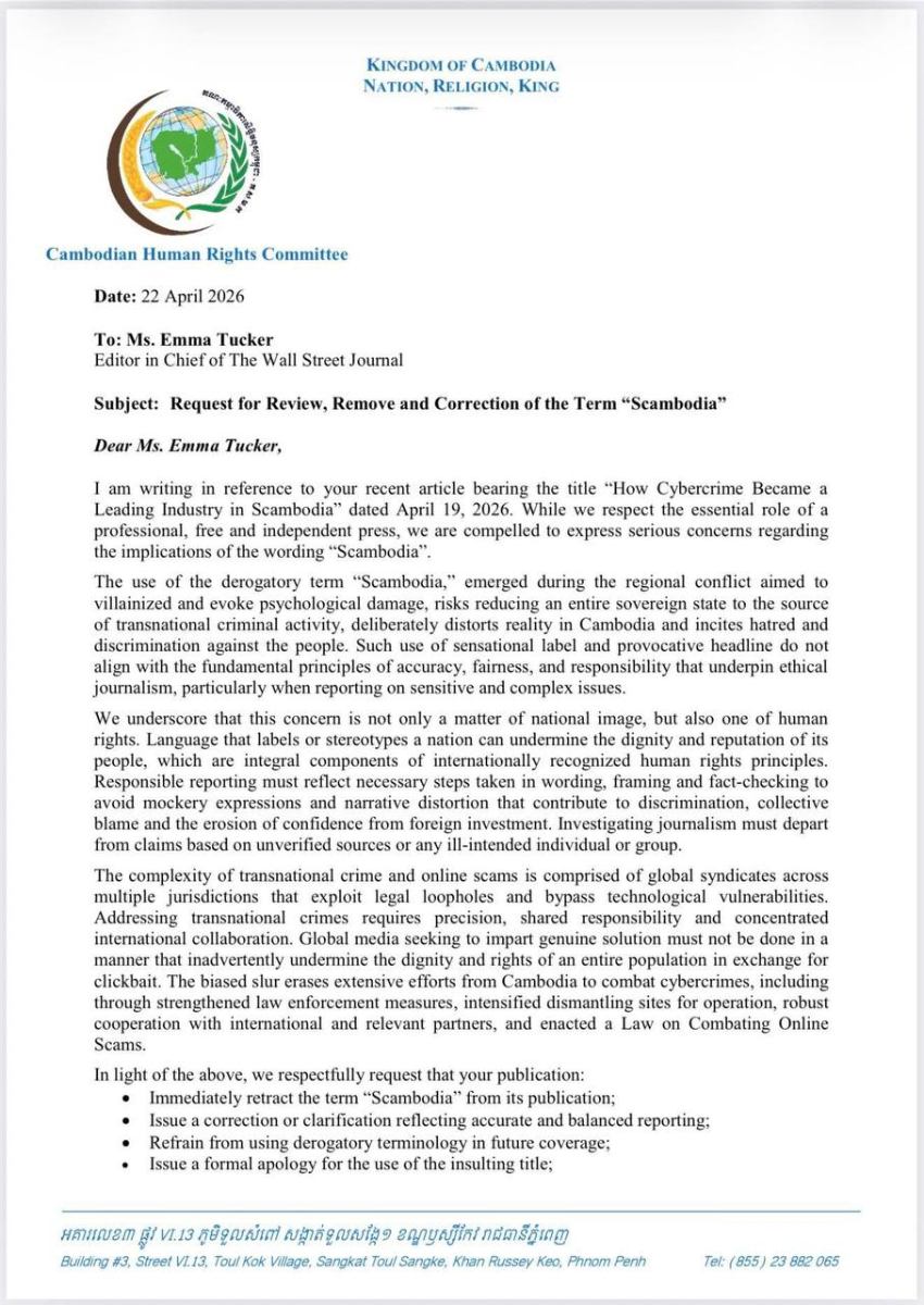 ភ្នំពេញ៖ គណៈកម្មាធិការសិទ្ធិមនុស្សកម្ពុជា (គ.ស.ម.ក.) នៅថ្ងៃទី២២ ខែមេសា ឆ្នាំ២០២៦នេះ បានស្នើទៅកាន់កាសែត The Wall Street Journal ឱ្យលុបពាក្យ “Scambodia” ចេញពីអត្ថបទរបស់ខ្លួន និងសុំទោសជាផ្លូវការចំពោះកម្ពុជាលើការចុះផ្សាយរបស់ខ្លួន។