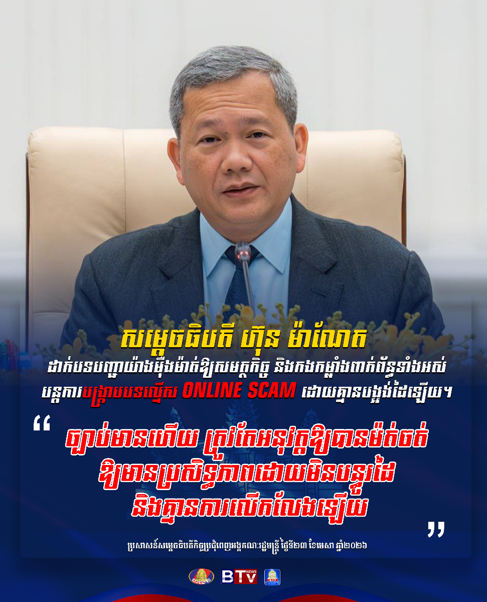 ភ្នំពេញ៖ នៅក្នុងកិច្ចប្រជុំពេញអង្គគណៈរដ្ឋមន្ត្រីកាលពីថ្ងៃទី ២៣ ខែមេសា ឆ្នាំ ២០២៦នេះ សម្ដេចមហាបវរធិបតី ហ៊ុន ម៉ាណែត នាយករដ្ឋមន្រ្ដីនៃកម្ពុជា បន្តដាក់បទបញ្ជាយ៉ាងម៉ឺងម៉ាត់បំផុតឱ្យសមត្ថកិច្ច និងកងកម្លាំងពាក់ព័ន្ធទាំងអស់បន្តការបង្ក្រាបបទល្មើសការឆបោកតាមប្រព័ន្ធបច្ចេកវិទ្យាដោយគ្មានបង្អង់ដៃឡើយ។