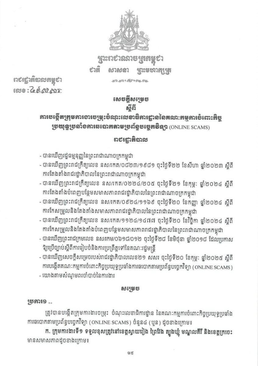 រាជរដ្ឋាភិបាលកម្ពុជា បង្កើតក្រុមការងារចម្រុះចំណុះលេខាធិការដ្ឋាន គ.ប.ឆ.ប.ដើម្បីបង្កើនប្រសិទ្ធភាពបង្ក្រាប និងបោសសម្អាតការឆបោកតាមប្រព័ន្ធបច្ចេកវិទ្យា