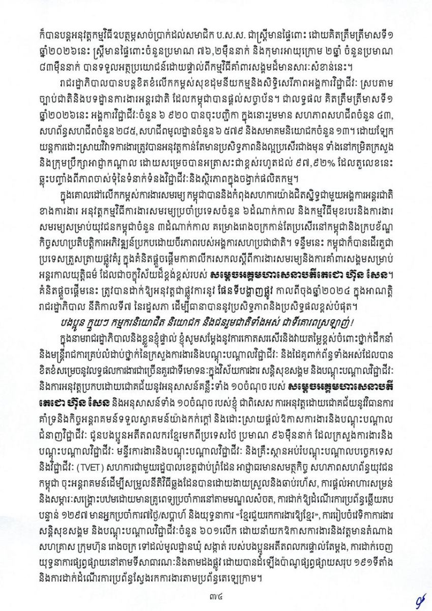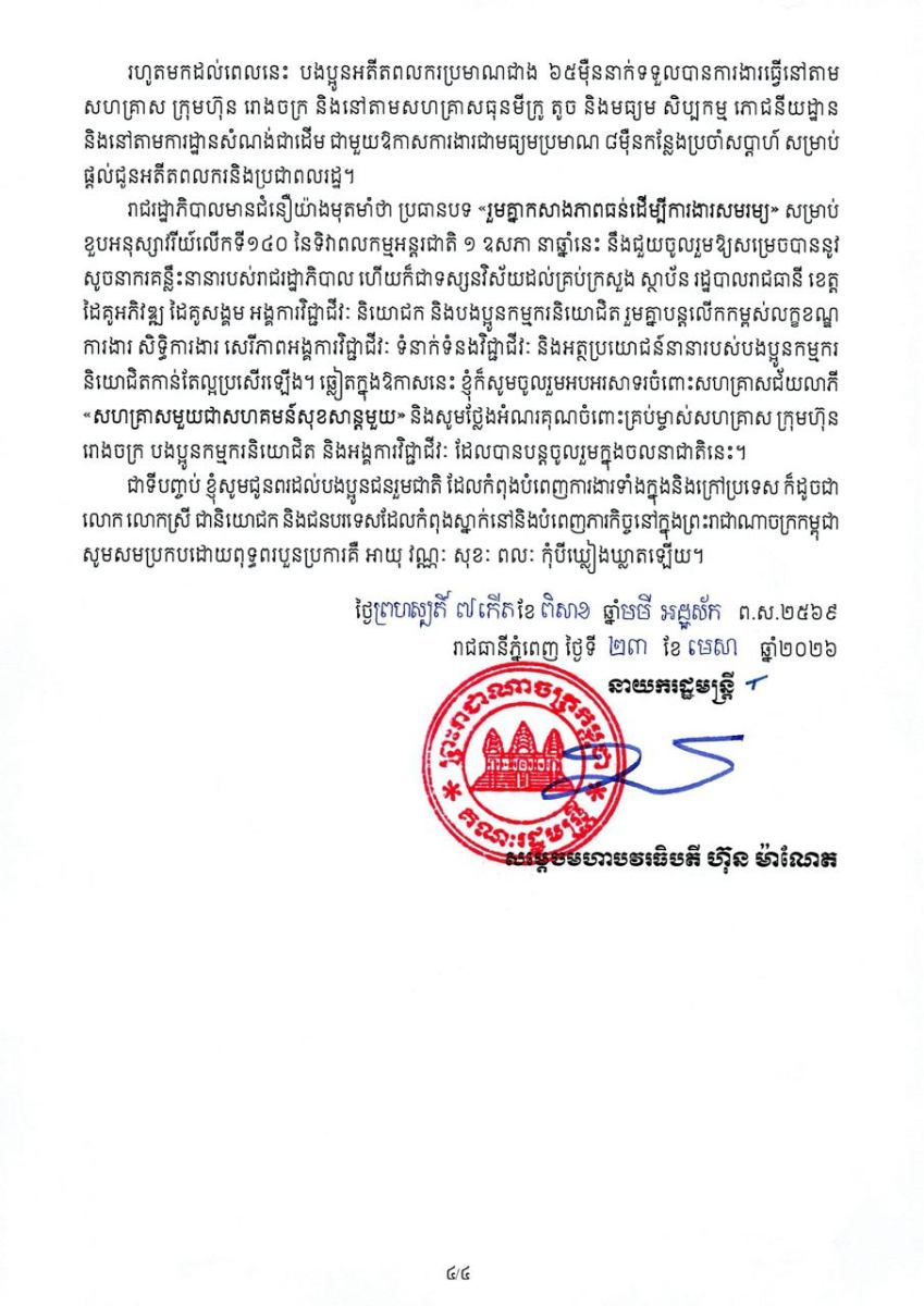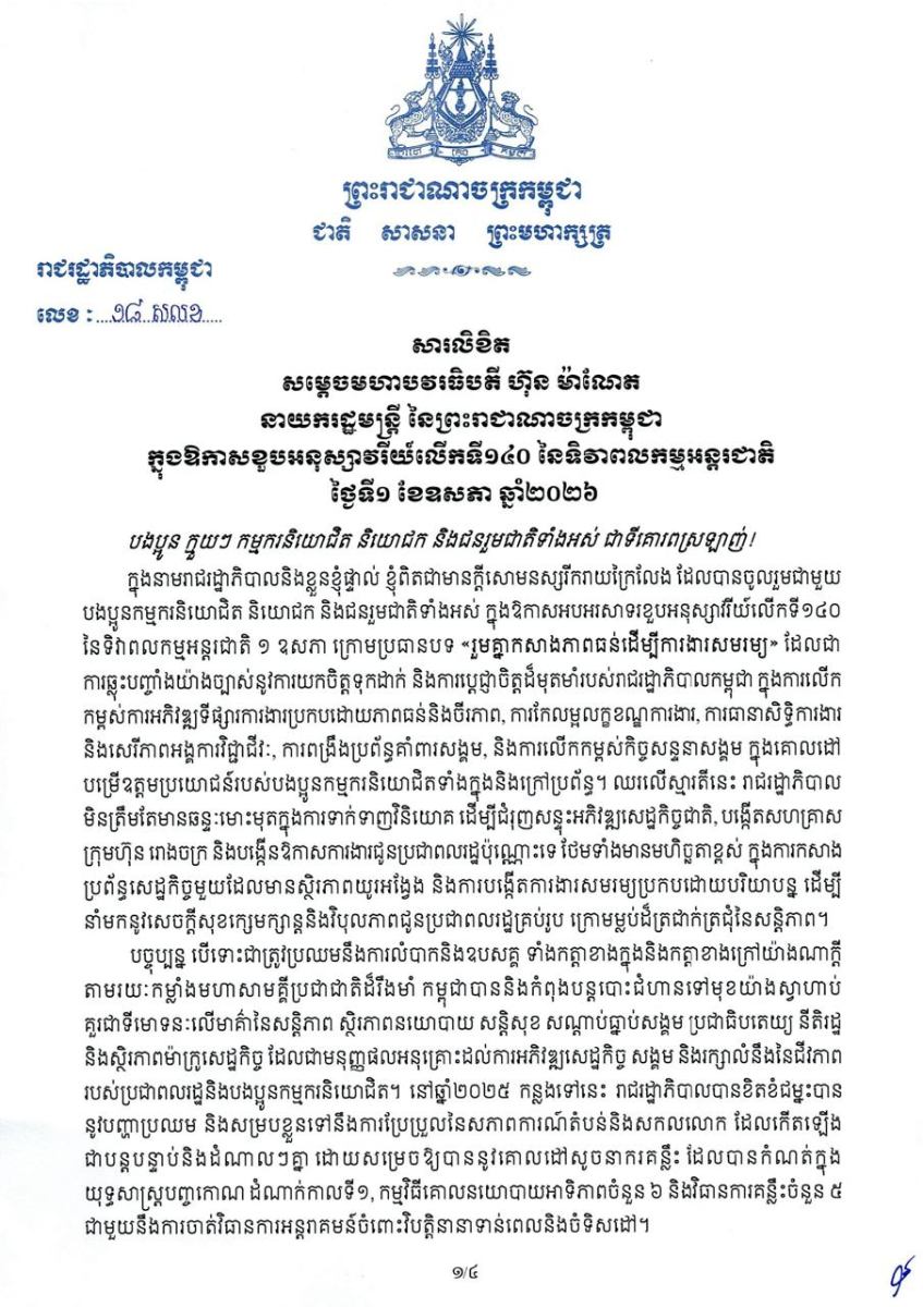 គិតត្រឹមត្រីមាសទី១ ឆ្នាំ២០២៦នេះ ចំនួនសហគ្រាស ក្រុមហ៊ុន រោងចក្រ បានកើនឡើងដល់ចំនួន ៤៧ ០២៩សហគ្រាស ជាមួយនឹងចំនួនកម្មករ និយោជិតសរុបកើនឡើងដល់ប្រមាណ ២,៣លាននាក់។ នេះបើតាមខ្លឹមសារនៅក្នុងសារលិខិតសម្តេចមហាបវរធិបតី ហ៊ុន ម៉ាណែត នាយករដ្ឋមន្ត្រី នៃព្រះរាជាណាចក្រកម្ពុជា ក្នុងឱកាសខួបអនុស្សាវរីយ៍លើកទី១៤០ នៃទិវាពលកម្មអន្តរជាតិថ្ងៃទី១ ខែឧសភា ឆ្នាំ២០២៦។