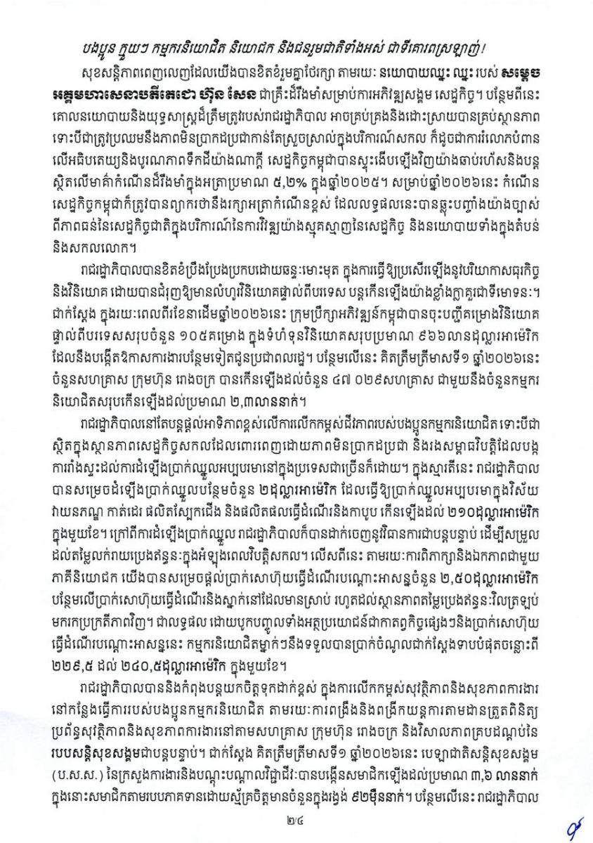 សម្ដេចធិបតី មានប្រសានស៍បញ្ជាក់ថា បើទោះជាត្រូវប្រឈមនឹងការលំបាកនិងឧបសគ្គ ទាំងកត្តាខាងក្នុងនិងកត្តាខាងក្រៅយ៉ាងណាក្តី តាមរយៈកម្លាំងមហាសាមគ្គីប្រជាជាតិដ៏រឹងមាំ កម្ពុជាបាននិងកំពុងបន្តបោះជំហានទៅមុខយ៉ាងស្វាហាប់ គួរជាទីមោទនៈលើមាគ៌ានៃសន្តិភាព ស្ថិរភាពនយោបាយ សន្តិសុខ សណ្តាប់ធ្នាប់សង្គម ប្រជាធិបតេយ្យ នីតិរដ្ឋ និងស្ថិរភាពម៉ាក្រូសេដ្ឋកិច្ច ដែលជាមនុញ្ញផលអនុគ្រោះដល់ការអភិវឌ្ឍសេដ្ឋកិច្ច សង្គម និងរក្សាលំនឹងនៃជីវភាពរបស់ប្រជាពលរដ្ឋ និងបងប្អូនកម្មករនិយោជិត។