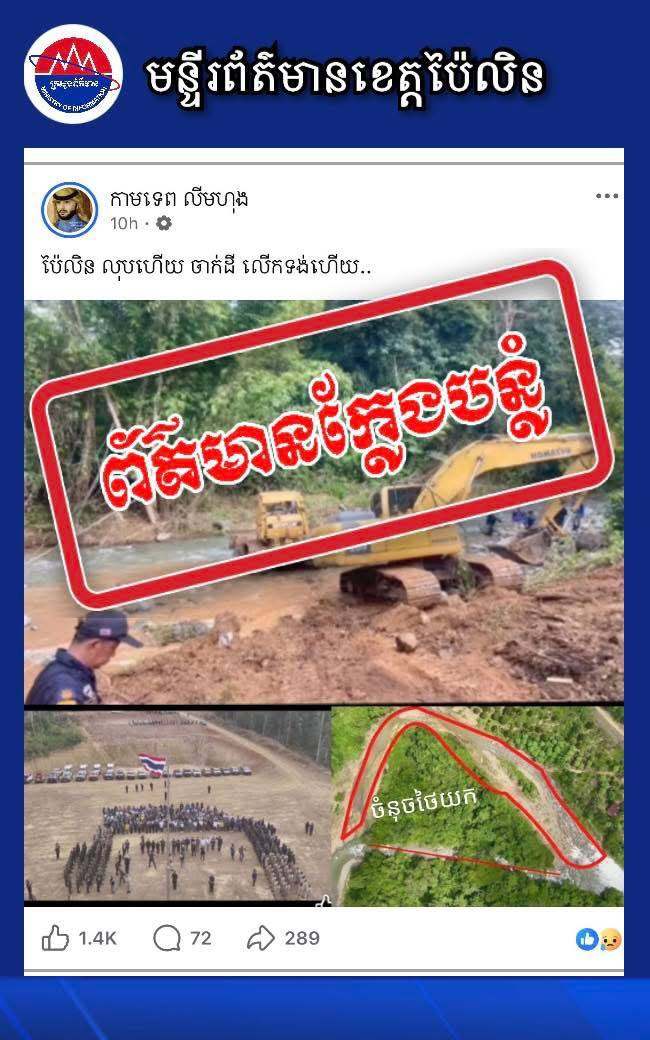 រដ្ឋបាលខេត្តប៉ៃលិនប្រកាសបដិសេធ និងច្រានចោលការផ្សាយព័ត៌មានបំភ្លៃដែលចោទថា «ថៃបានឈ្លានពានចូលទឹកដីខ្មែរនៅខេត្តប៉ៃលិន»