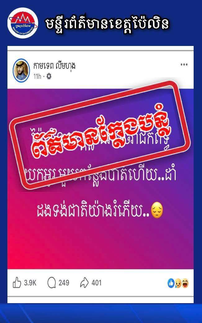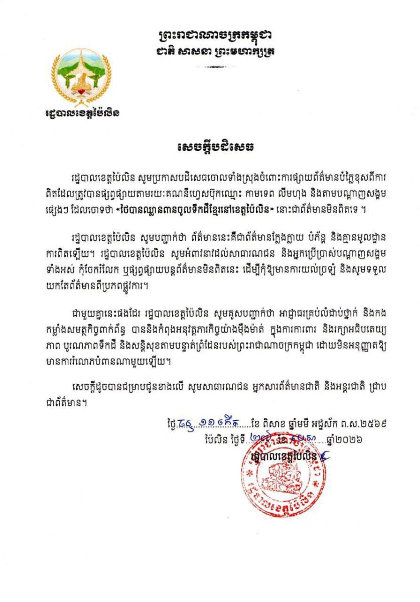 រដ្ឋបាលខេត្តប៉ៃលិន នៅថ្ងៃទី២៧ ខែមេសា ឆ្នាំ២០២៦នេះ បានប្រកាសបដិសេធ និងច្រានចោលទាំងស្រុងចំពោះការផ្សាយព័ត៌មានបំភ្លៃខុសពីការពិតដែលត្រូវបានផ្សព្វផ្សាយតាមរយៈគណនីហ្វេសប៊ុកឈ្មោះ កាមទេព លីមហុង និងតាមបណ្តាញសង្គមផ្សេងៗ ដែលចោទថា «ថៃបានឈ្លានពានចូលទឹកដីខ្មែរនៅខេត្តប៉ៃលិន»។