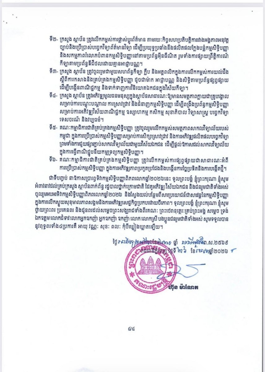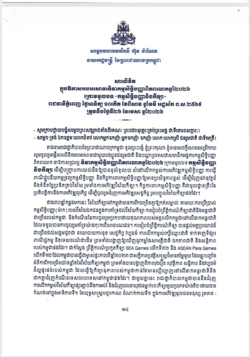 នេះបើតាមការបញ្ជាក់របស់សម្ដេចមហាបវរធិបតី ហ៊ុន ម៉ាណែត នាយករដ្ឋមន្រ្ដីនៃកម្ពុជា តាមរយៈសារលិខិត អបអរសាទរទិវាកម្មសិទ្ធិបញ្ញាពិភពលោកឆ្នាំ២០២៦ ក្រោមមូលបទ «កម្មសិទ្ធិបញ្ញា និងកីឡា» នៅថ្ងៃទី២៦ ខែមេសា ឆ្នាំ២០២៦នេះ។