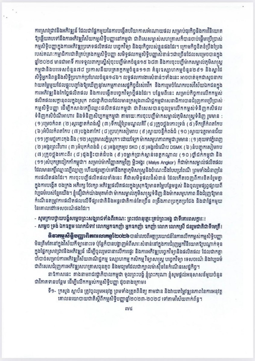 សម្ដេចធិបតីបានថ្លែងថា ក្រោមកិច្ចខិតខំប្រឹងប្រែងរបស់គណៈកម្មាធិការជាតិគ្រប់គ្រងកម្មសិទ្ធិបញ្ញា សមិទ្ធផលកម្មសិទ្ធិបញ្ញាសំខាន់ៗជាច្រើនដែលសម្រេចបានក្នុង ឆ្នាំ២០២៥ មានជាអាទិ៍ ការទទួលពាក្យស្នើសុំចុះបញ្ជីម៉ាកចំនួន ១៥ ៦៨៣ និងការចុះបញ្ជីម៉ាកសម្គាល់ភូមិសាស្ត្រកម្ពុជា និងបរទេសចំនួន ៧៨ ប្រកាសនីយបត្រតក្កកម្មចំនួន ១១៣ គំនូរឧស្សាហកម្មចំនួន ២៩១ និងស្នាដៃ សិទ្ធិអ្នកនិពន្ធ និងសិទ្ធិប្រហាក់ប្រហែលចំនួន១៤៦។ លទ្ធផលការងារសំខាន់ៗទាំងនេះ អាចចាត់ទុកជាសូចនាករ វាយតម្លៃមួយដែលឆ្លុះបញ្ចាំងឱ្យឃើញនូវសកម្មភាពសេដ្ឋកិច្ចដ៏រស់រវើក និងការរួមចំណែករបស់វិស័យឯកជនក្នុង ការអភិវឌ្ឍនិងកែច្នៃផលិតផល និងការបង្កើតបច្ចេកវិទ្យាថ្មីផងដែរ។