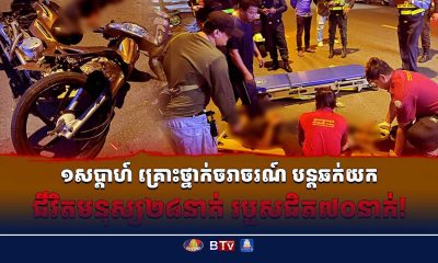ក្នុងរយៈពេល១សប្តាហ៍ ពោលគិតចាប់ពីថ្ងៃទី៨ រហូតដល់ថ្ងៃទី១៤ ខែតុលា ឆ្នាំ២០២៥ កន្លងមកនេះ មានហេតុការណ៍គ្រោះថ្នាក់ចរាចរណ៍ផ្លូវគោកនៅទូទាំងប្រទេស បានបន្តកើតឡើងចំនួន ៥៨ករណី បណ្តាលឱ្យមានមនុស្សស្លាប់ចំនួន ២៨នាក់ និងរងរបួសធ្ងន់ស្រាលចំនួន ៦៧នាក់។ នេះបើតាមលោក ទូច សុឃៈ អ្នកនាំពាក្យរងក្រសួងមហាផ្ទៃ។ បើតាមអ្នកនាំពាក្យរង ករណីគ្រោះថ្នាក់ចរាចរណ៍នោះ រួមមាន នៅថ្ងៃទី៨តុលា មាន១២ករណី ស្លាប់៦នាក់ របួស១០នាក់ ថ្ងៃទី៩ មាន៨ករណី...