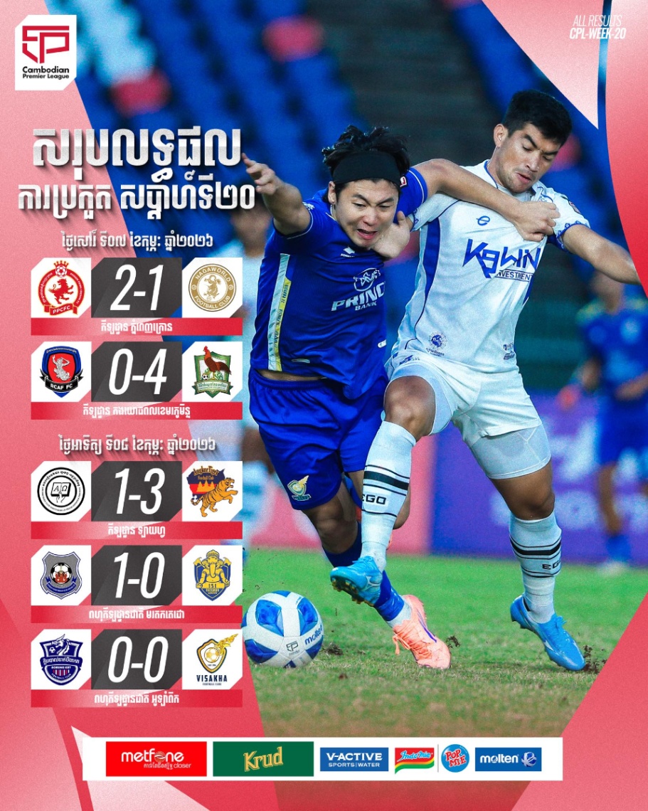 ក្រុមព្រះខ័នរាជស្វាយរៀង បានបន្ដឈរកំពូលតារាងបណ្ដោះអាសន្ន នៅត្រឹមសប្ដាហ៍ទី២០ នៃលីគកំពូលកម្ពុជា ឆ្នាំ២០២៥/២៦ ក្រោយយកឈ្នះក្រុមភ្ញៀវ ISI ដង្កោសែនជ័យ ដោយលទ្ធផល ១-០ នៅចុងម៉ោង ក្នុងជំនួបជើងទី២ កាលពីរាត្រីថ្ងៃអាទិត្យ នៅពហុកីឡដ្ឋានជាតិមរតកតេជោ។