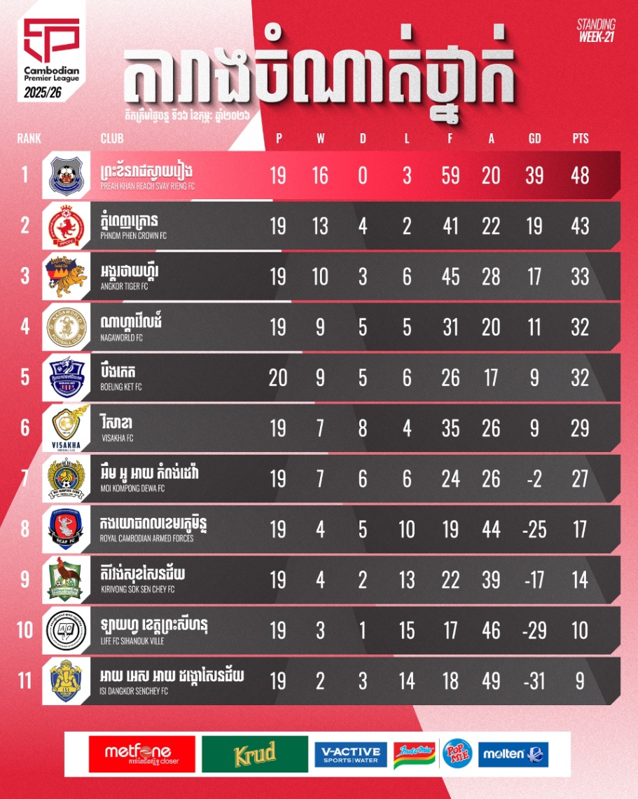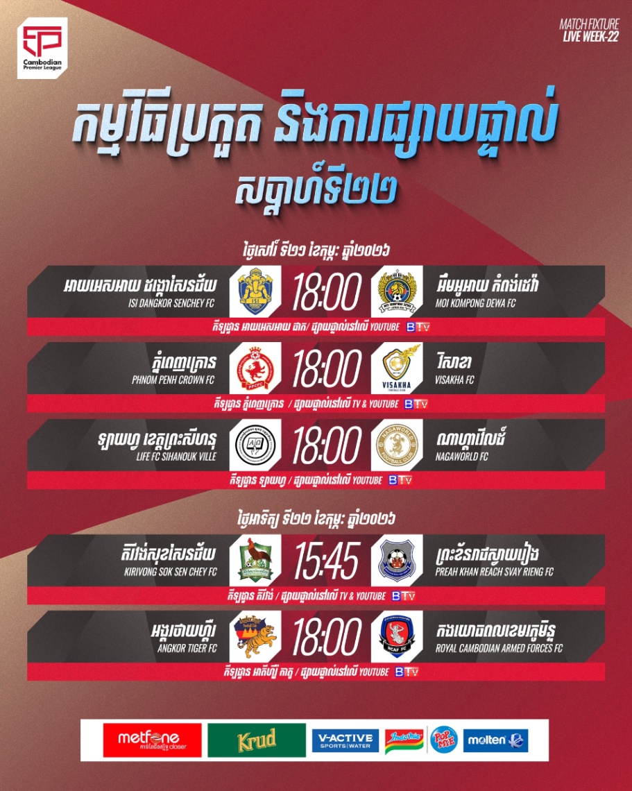 ថ្ងៃសៅរ៍ទី២១ ខែកុម្ភៈ ឆ្នាំ២០២៦នេះ ក្លឹបបាល់ទាត់វិសាខា ត្រូវស្វែងរកពិន្ទុ ជាមួយភ្នំពេញក្រោនដែលត្រូវការពិន្ទុប្រជែងជើងឯកជាមួយព្រះខ័នរាជស្វាយរៀង ខណៈដែលអឹមអូអាយកំពង់ដេវ៉ា ត្រូវការបីពិន្ទុដាច់ខាតពេលជួបអាយអេសអាយ ដង្កោសែនជ័យថ្ងៃជាមួយគ្នា។
