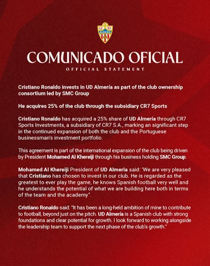 Ronaldo ទិញភាគហ៊ុន ២៥% វិនិយោគក្លិបនៅលីគទីពីរអេស្ប៉ាញ Almeria